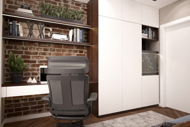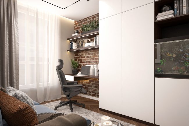 W gabinecie harmonijnie łączy się praktyczność i komfort. Duża szafa z białymi frontami, naturalna cegła na ścianie i akwarium nadają przestrzeni roboczej niepowtarzalności. Rozkładana sofa dla gości tworzy możliwość wykorzystania tej przestrzeni do odpoczynku i rozrywki.