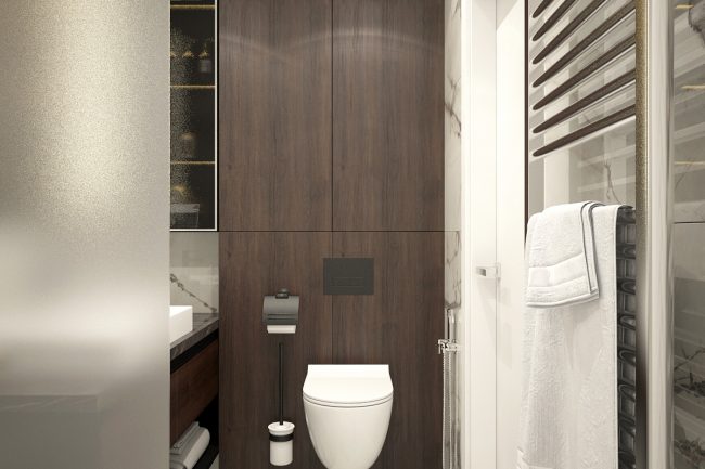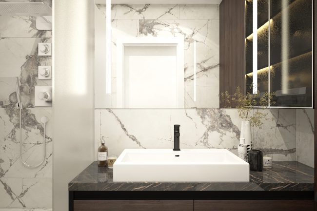 Łazienka zachwyca swoją wyrafinowaniem. Zastosowanie płytek pod kararyjski marmur i emaliowane cegiełki tworzy eleganckie tło. Drewniana okleina pod toaletą dodaje naturalnego ciepła, a podświetlenie wbudowane w podłogę tworzy atmosferę spokoju.