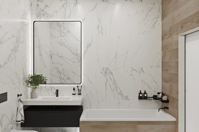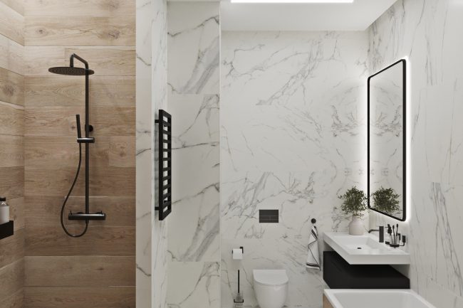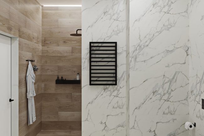 Toalety wykonane są z uwzględnieniem elegancji i praktyczności. Teksturalne drewniane elementy łączą się z płytkami imitującymi marmur. Taki koncepcyjny design sprawia, że każde pomieszczenie w tym domu jest unikalne.