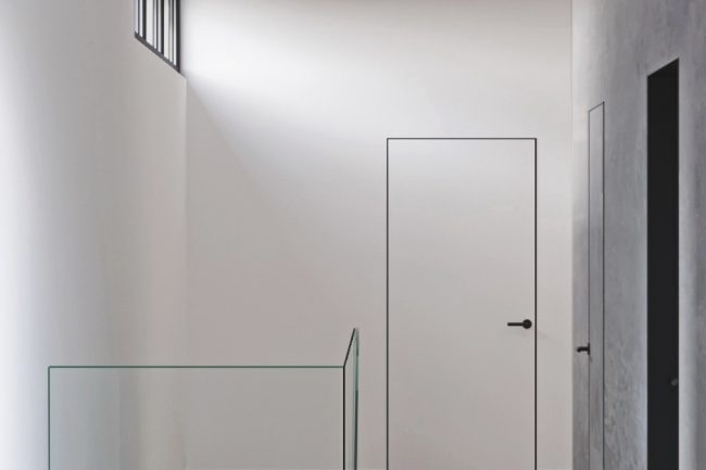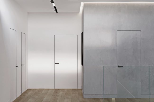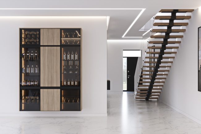 W tej przestrzeni znajduje się także duże lustro od podłogi do sufitu, które poszerza przestrzeń i wizualnie zwiększa jej rozmiar. Szerokie schody na metalowej konstrukcji z drewnianymi stopniami i szklanym balustradą prowadzą na drugi piętro, tworząc wrażenie lekkości i przezroczystości.
