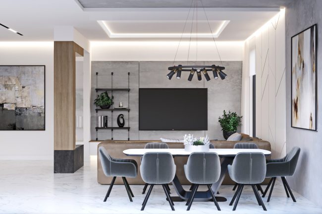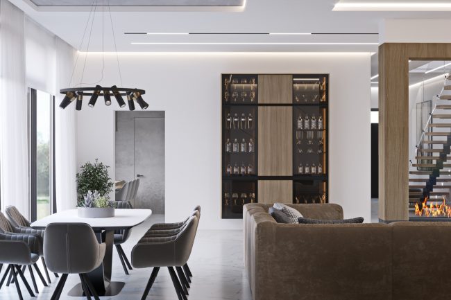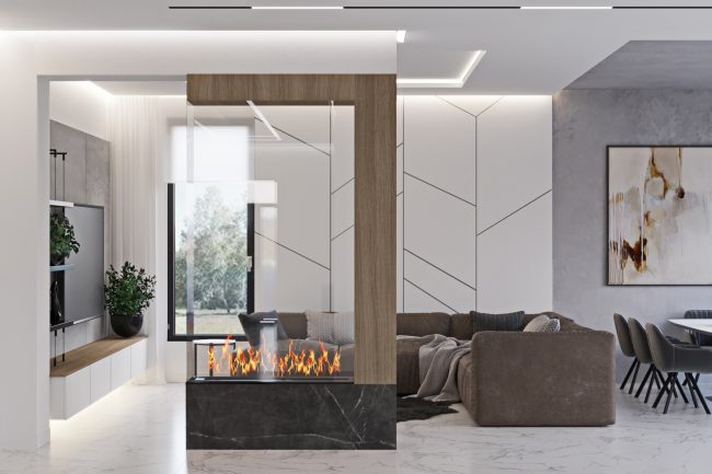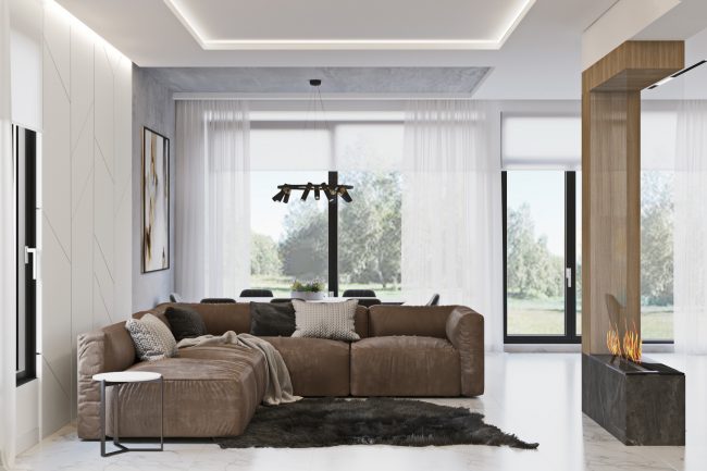 Salon jest prawdziwym centrum pomieszczenia. Biokominek wyłożony ciemnoszarym marmurem emituje ciepło i luksus. Duża narożna sofa z telewizorem tworzą idealny kącik do wypoczynku. Strefa jadalna z wydłużonym stołem i dużą barką wygląda stylowo i funkcjonalnie.