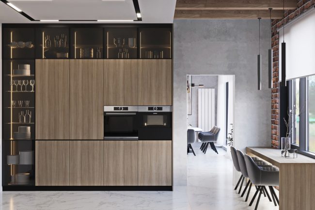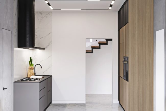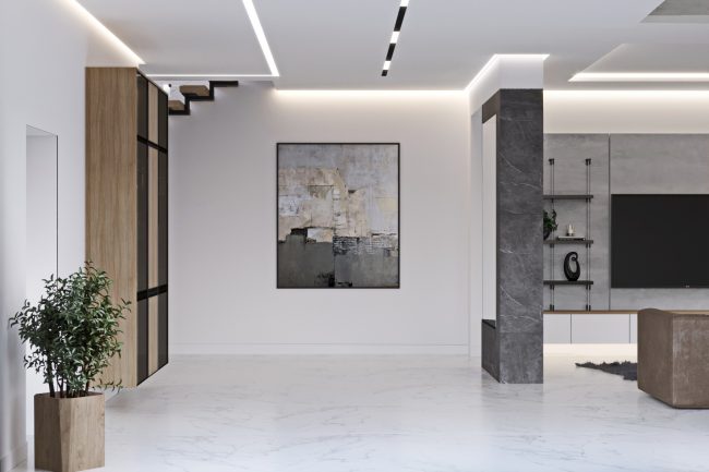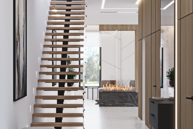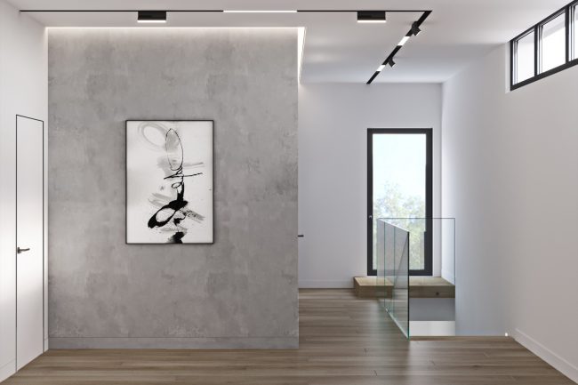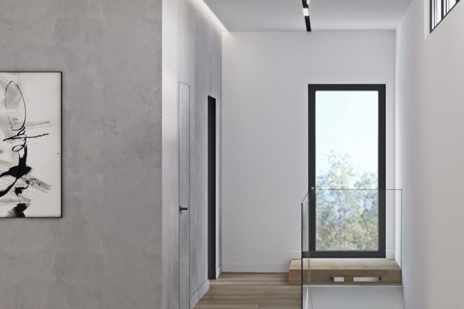 W designie wnętrza nowoczesnego domu z elementami loftu, każdy zakątek zachwyca swoją estetyką i funkcjonalnością. Przy wejściu wita was szeroki korytarz, który płynnie przechodzi w salon. Ściany korytarza ozdobione są drewnianymi panelami z czarnym szwem, nadającymi pomieszczeniu stylowy, indywidualny charakter.