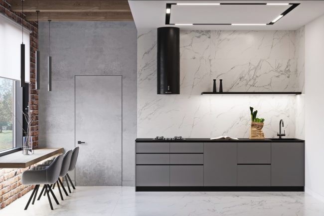 Podłoga w tym domu to prawdziwe dzieło sztuki. Duże formaty białego marmuru z szarym żyłkowaniem nadają każdemu pomieszczeniu luksusowy wygląd. Kuchnia zachwyca połączeniem drewnianych i szarych frontów, a barek z trzema krzesłami tworzy atmosferę przytulności i towarzyskości.