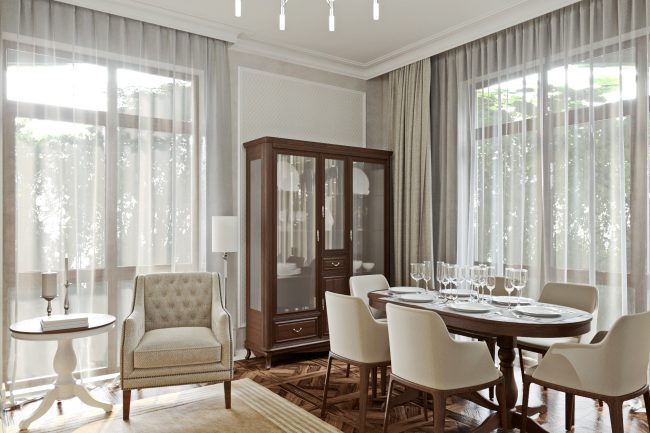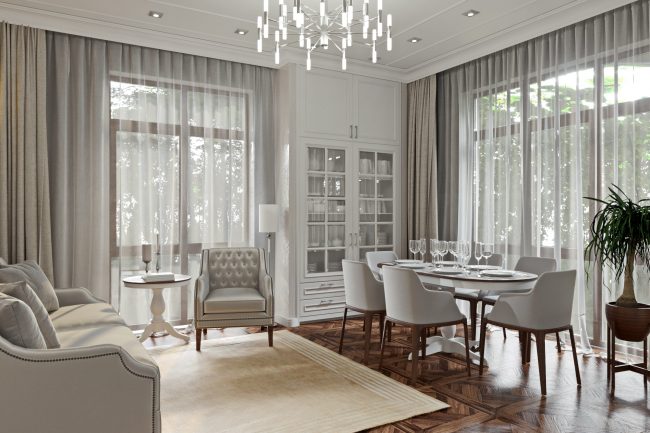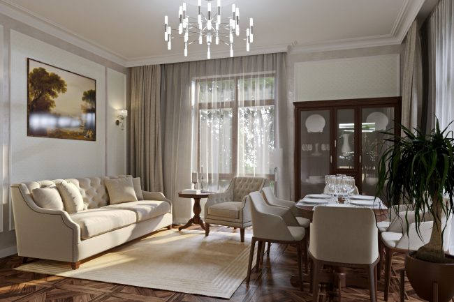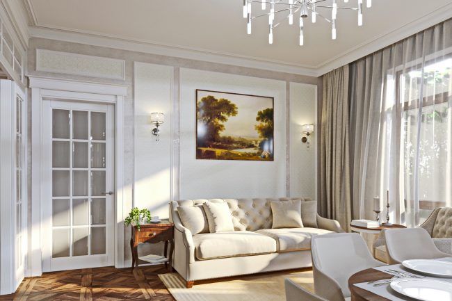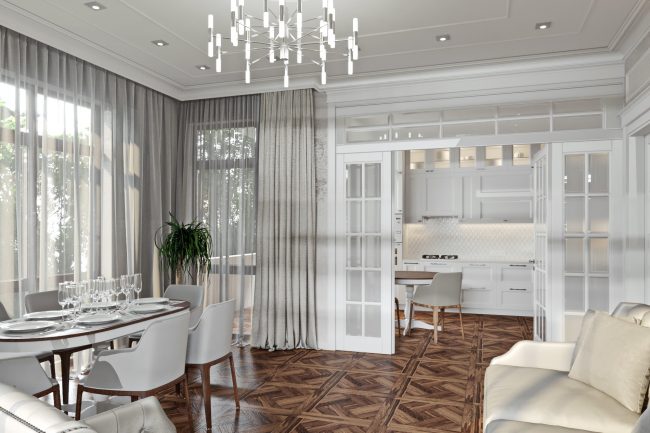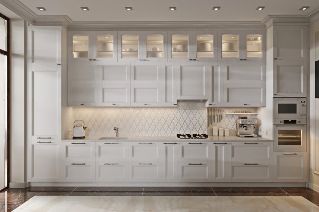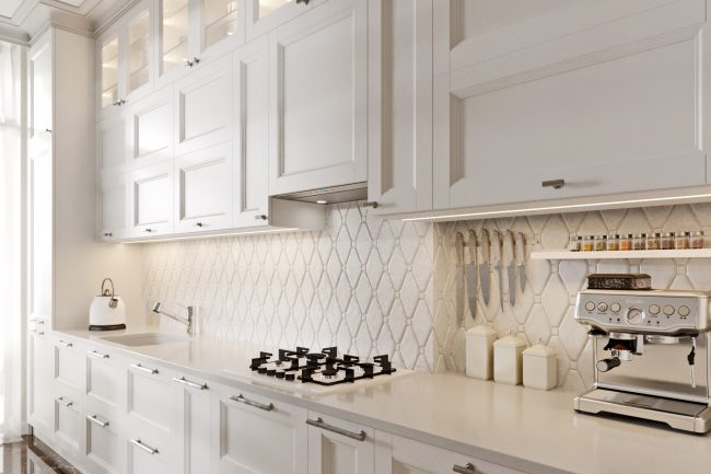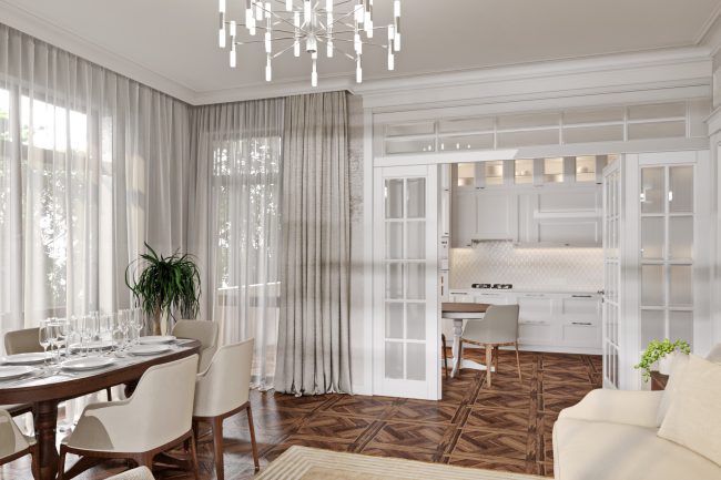 Kawalerka w stylu klasycznym zawiera wiele eleganckich elementów, które tworzą atmosferę wyrafinowania. Na podłodze znajduje się parkiet ozdobny z orzecha, który nadaje przestrzeni ciepła i stylu. Meble kuchenne wykonane są z jasnego drewna, pomalowane na biało, co nadaje wnętrzu świeżości i lekkości. Blat pod marmur oraz płytki na podłodze z ciepłymi żyłkami dopełniają elegancji kuchni.