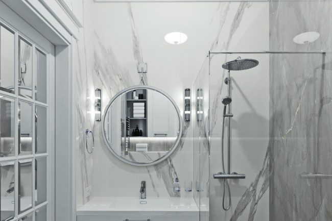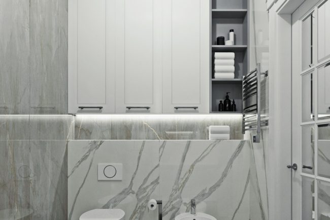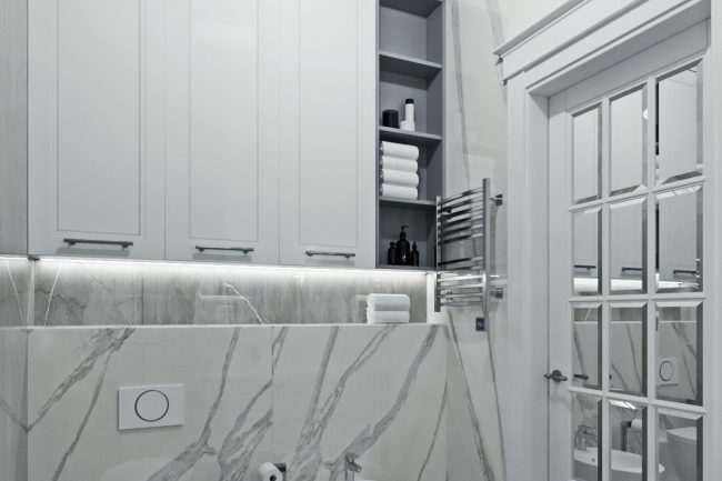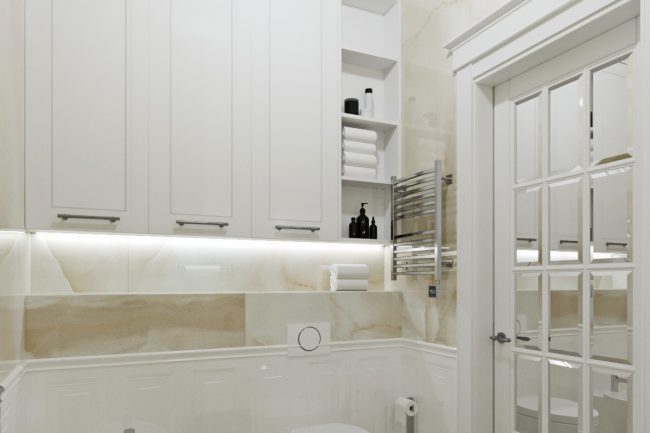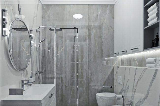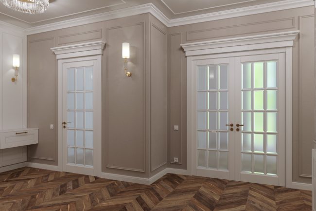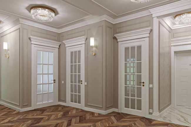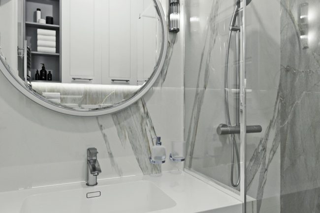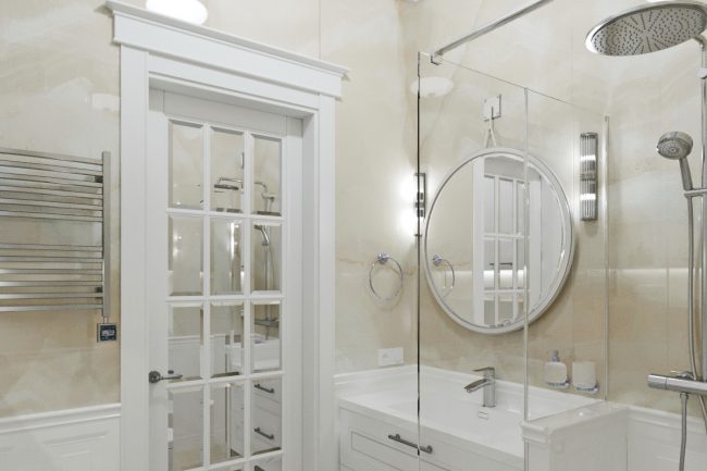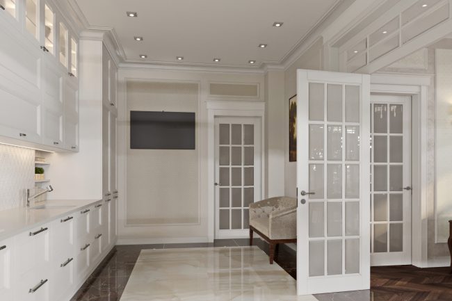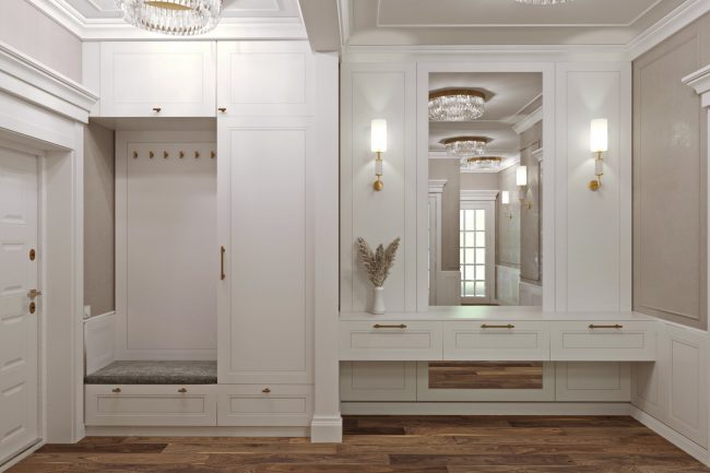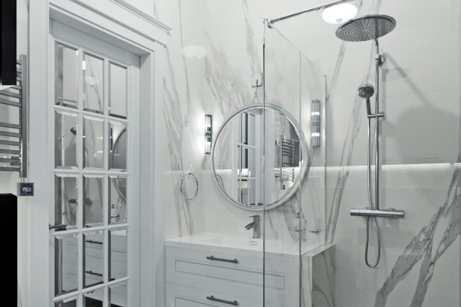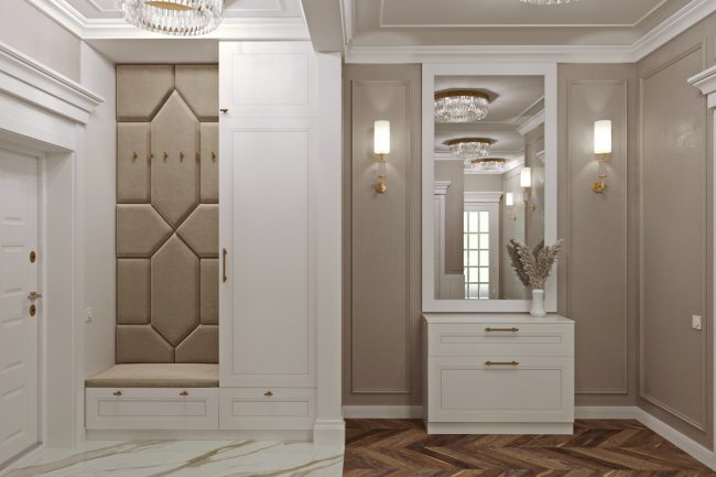 Klasyczna armatura oraz szklana kabina prysznicowa tworzą komfortowe warunki w łazience. W korytarzu na ścianach umieszczono panele, które dodają klasycznego wyglądu. Sufit wykonany jest na kilku poziomach z płyt kartonowo-gipsowych, wykorzystując dużą ilość gzymsów i listew ozdobnych, co podkreśla elegancję pomieszczenia. Oświetlenie jest klasyczne, co dopełnia całościowy wygląd wnętrza, czyniąc je przytulnym i eleganckim.