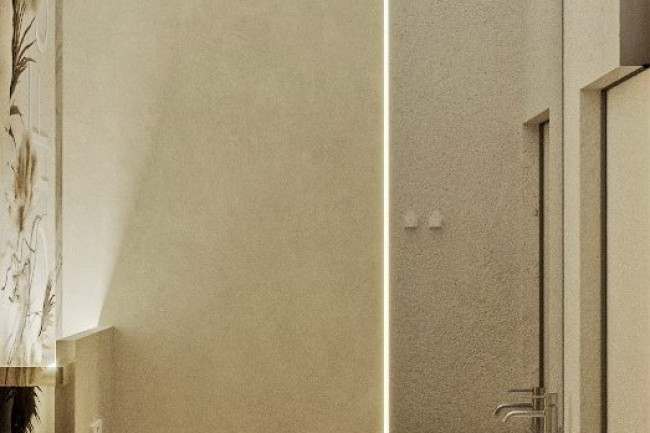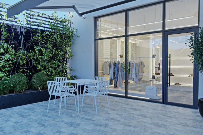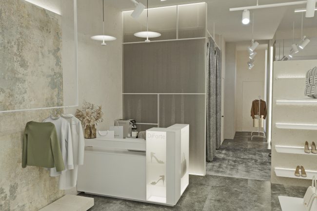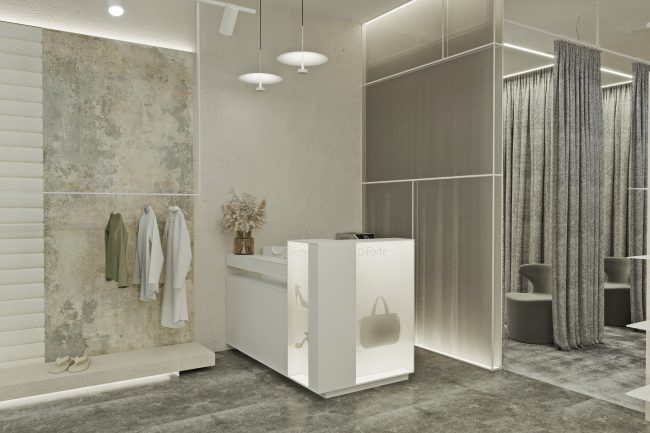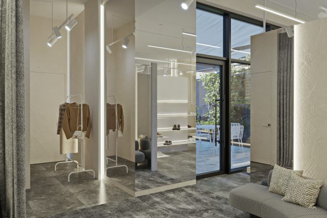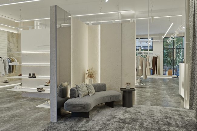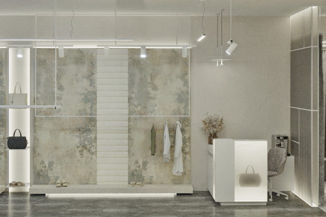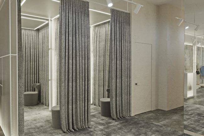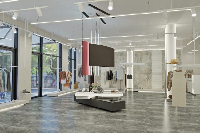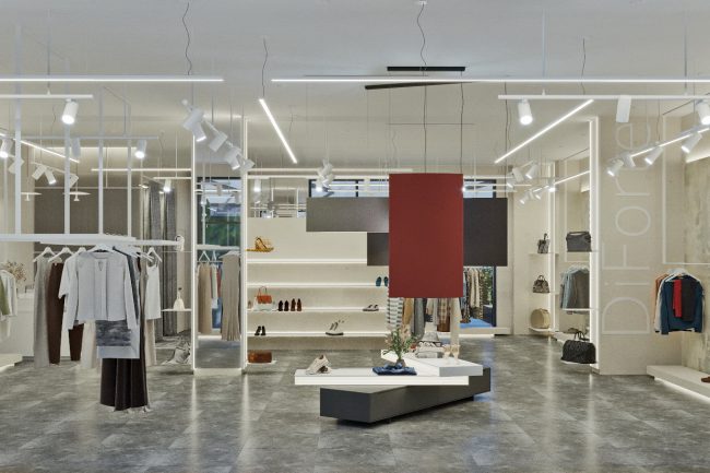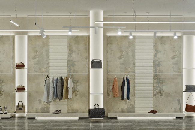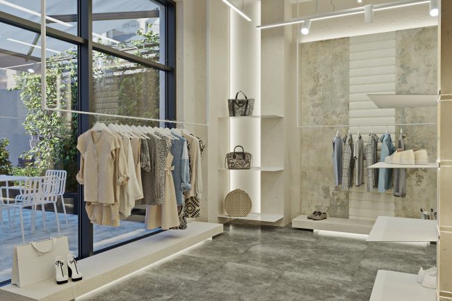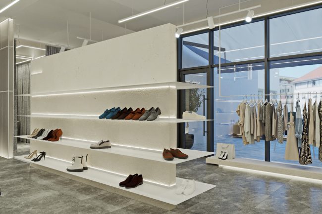 W centrum pomieszczenia znajduje się ekspozycyjna komoda, pokryta stylowym towarem. Półki wzdłuż ścian wyglądają jak dzieło sztuki, z powieszonymi ubraniami na tle szerokformatowych płytek z wstawkami z białych paneli skórzanych z perforacją. Każdy element staje się częścią wielkiej kompozycji, ujawniając estetykę markowej odzieży.