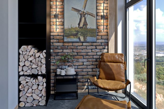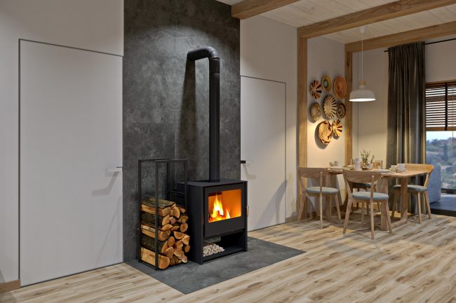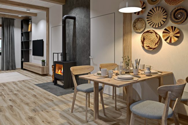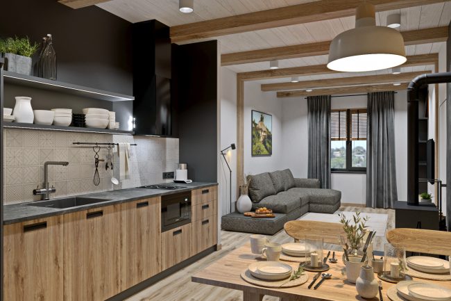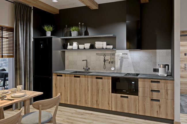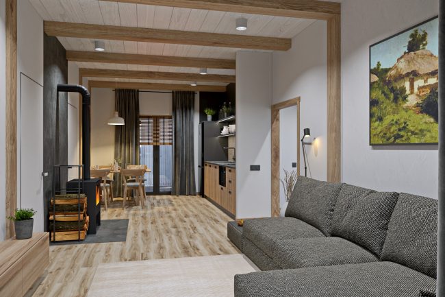 Kuchnia i salon zostały połączone w jedną przestronną jednostkę, co czyni je centralnym miejscem do spotkań i relaksu. Ważnym elementem wnętrza jest kominek typu piec, umieszczony na ścianie. Kominek nie tylko pełni funkcję grzewczą, ale także tworzy atmosferę ciepła i przytulności, co jest charakterystyczne dla stylu chalet. Strefa kuchenna utrzymana jest w minimalistycznym stylu z wykorzystaniem naturalnego drewna, co harmonizuje z prostotą i elegancją salonu.
