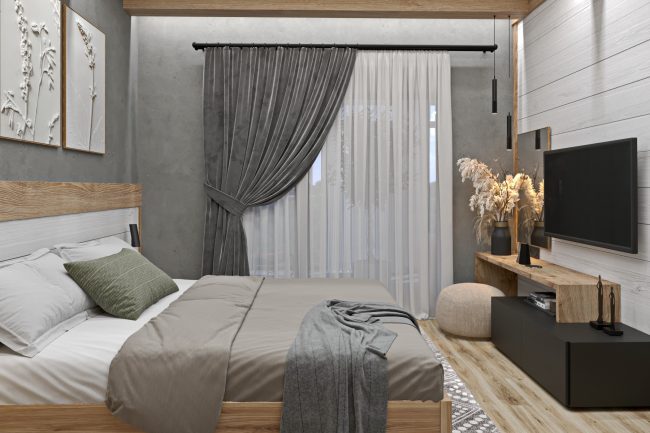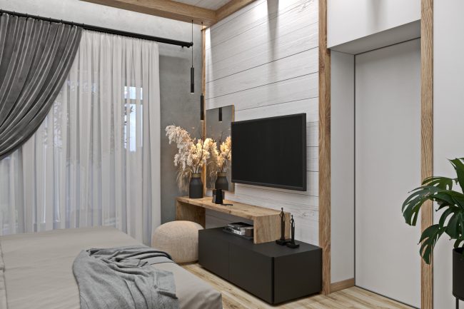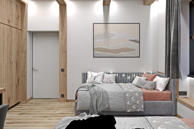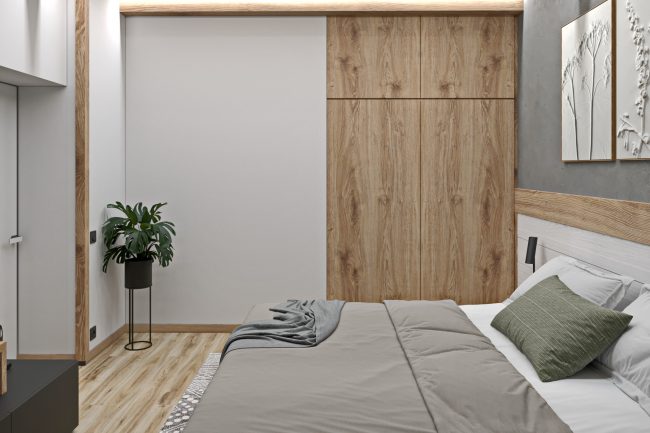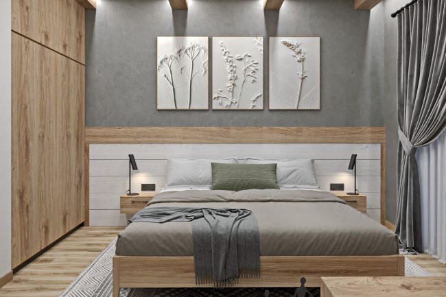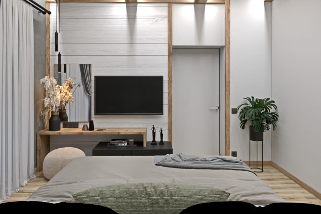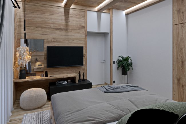 - Główna sypialnia — miejsce do relaksu i odpoczynku, gdzie wykorzystano ciepłe drewniane panele do stworzenia przytulnej atmosfery.