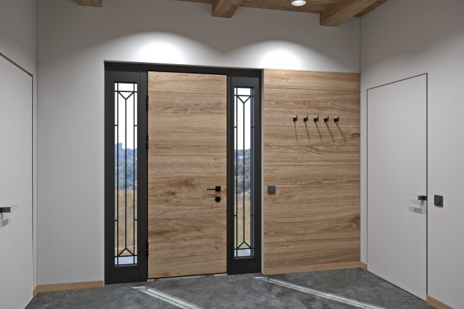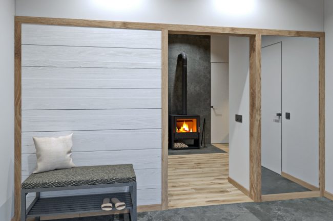 - Przedpokój — przestronna przestrzeń do przechowywania odzieży i obuwia z drewnianymi elementami, które uzupełniają ogólną stylistykę domu.