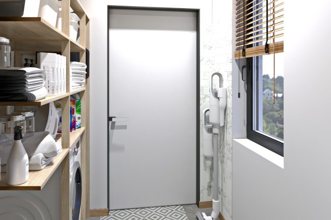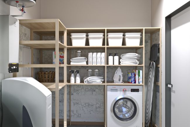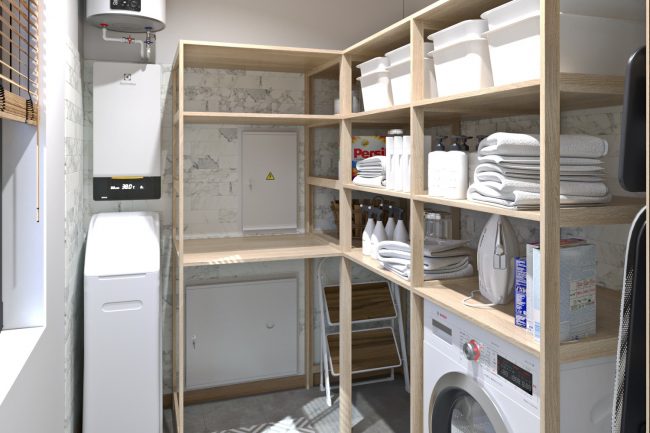 - Pomieszczenie techniczne — kompaktowe i funkcjonalne, przeznaczone do przechowywania sprzętu AGD oraz komunikacji.