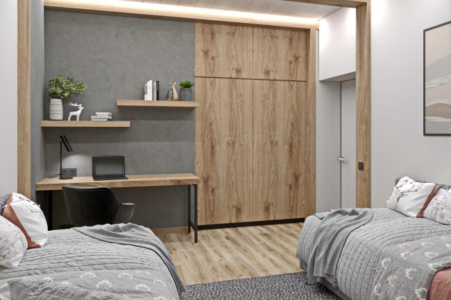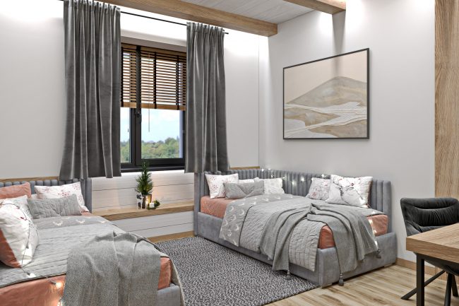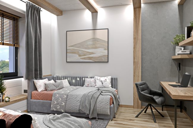 - Pokój dziecięcy dla dwojga dzieci — urządzony w jasnych kolorach, z funkcjonalnymi meblami do zabawy, nauki i odpoczynku.