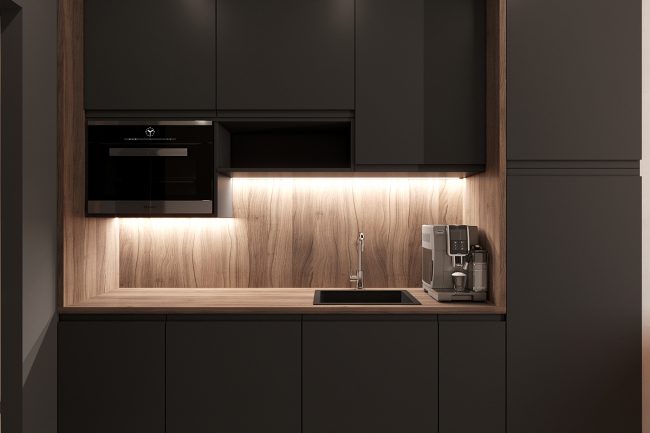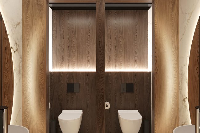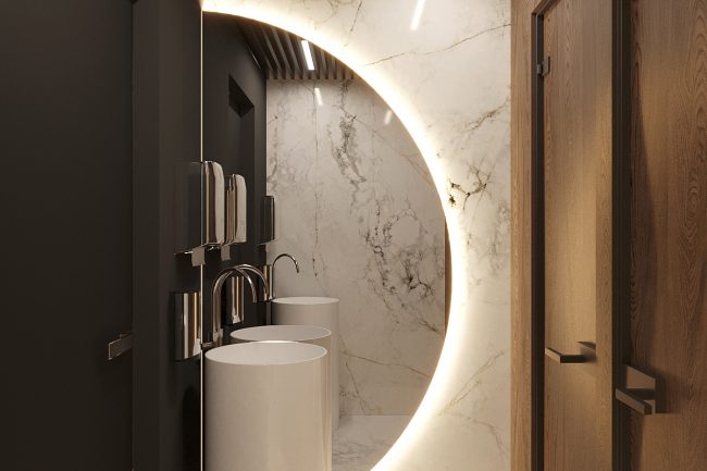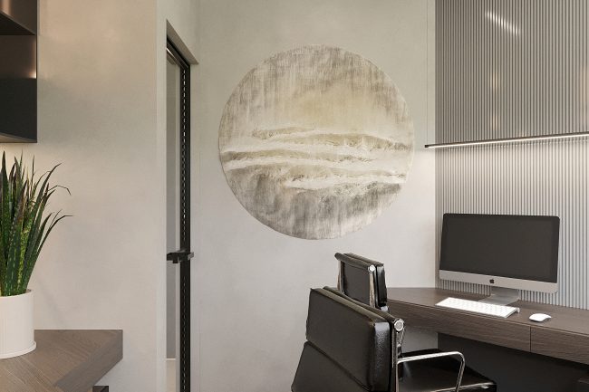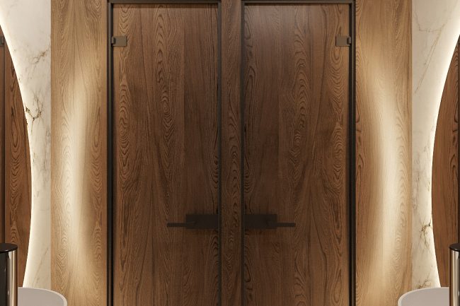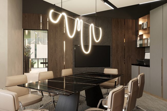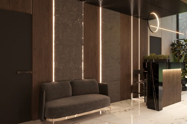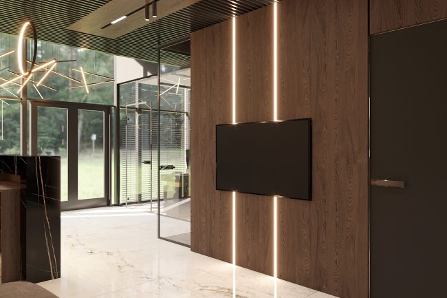 Marmur jest używany do pokrycia podłóg oraz wykończenia ścian, co zapewnia poczucie luksusu. Jego błyszcząca powierzchnia odbija światło, tworząc iluzję przestronności i lekkości. Oprócz tego drewniane panele w ciepłych odcieniach nadają przytulności i podkreślają elegancję biura. Mogą być stosowane do wykończenia ścian, przegrody lub mebli.