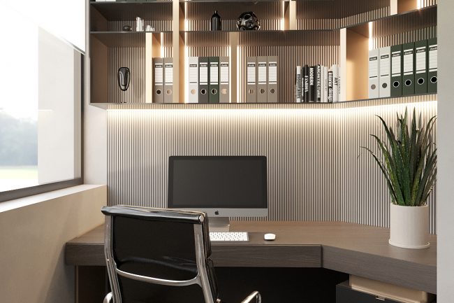 Meble biurowe wykonane są z naturalnych materiałów, podkreślając styl i jakość. Wygodne fotele i biurka z możliwością regulacji wysokości pomagają stworzyć idealne warunki do pracy. Paleta kolorów waha się od neutralnych odcieni do głębokich kolorów, nadając pomieszczeniu stylowy wygląd.