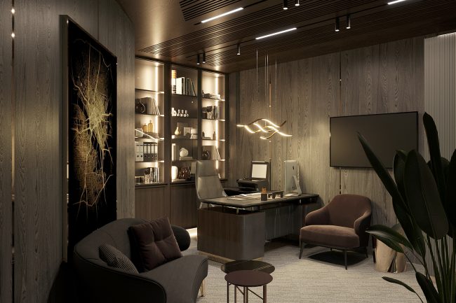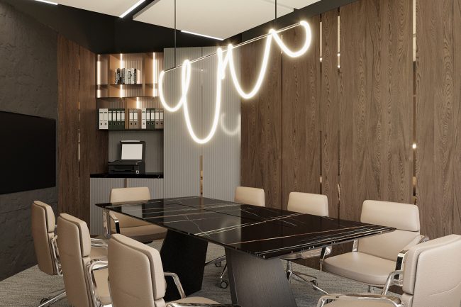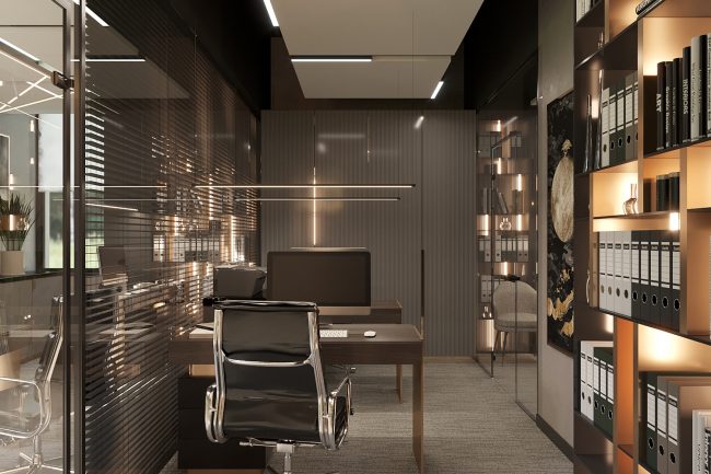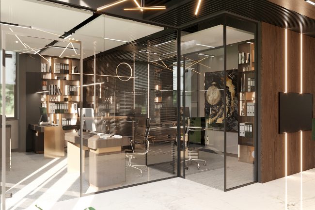 Design wnętrza biura VIP w nowoczesnym stylu dla firmy prawniczej łączy elegancję i funkcjonalność, tworząc przestrzeń, która odzwierciedla profesjonalizm i status. Głównymi elementami projektu są marmur, drewniane panele oraz przegrody szklane, które nadają biuru wyrafinowany wygląd.