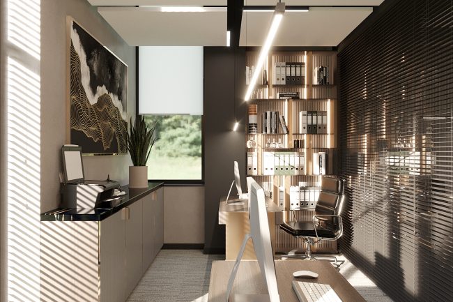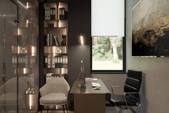 W ten sposób design wnętrza biura VIP w nowoczesnym stylu dla firmy prawniczej łączy estetykę i praktyczność, tworząc komfortowe i stylowe środowisko do pracy.