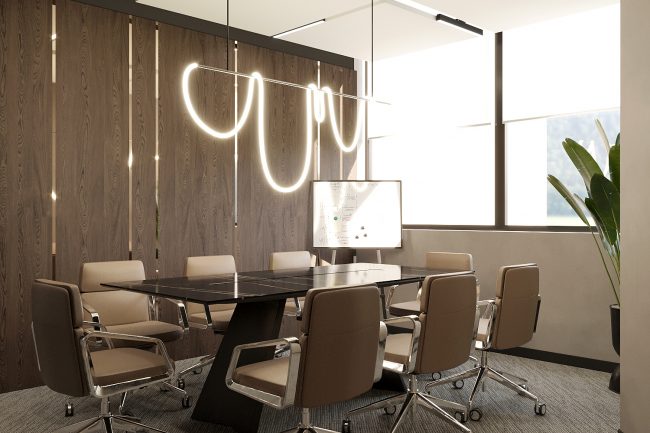 Decy biura obejmują nowoczesne obrazy, które podkreślają korporacyjny styl, a także rośliny doniczkowe, które dodają naturalnej energii. Odpowiednie oświetlenie, w tym lampy LED oraz lampy ścienne, tworzy komfortową atmosferę do pracy i spotkań.