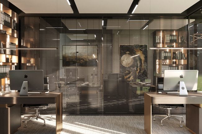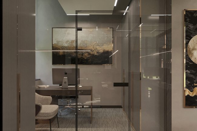 Przegrody szklane pozwalają zachować otwartość przestrzeni, jednocześnie zapewniając prywatność w pokojach do negocjacji. Nowoczesne technologie pozwalają stosować szkło z dodatkowymi funkcjami, takimi jak przyciemnienie lub tłumienie dźwięku, co czyni biuro bardziej komfortowym do pracy.