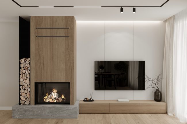 Szczególną uwagę poświęcono kominkowi, który stał się centralnym elementem dekoracyjnym w salonie. Jest on wykończony płytkami wielkoformatowymi imitującymi drewno, co dodaje przestrzeni naturalności i ciepła. Kominek pełni nie tylko funkcję dekoracyjną, ale także tworzy przytulność i komfort w dużej przestrzeni salonu.