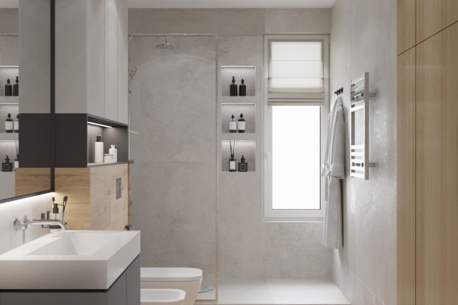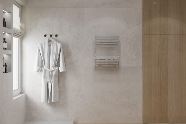 - Łazienki — urządzone w nowoczesnym stylu z wykorzystaniem płytek imitujących kamień, co podkreśla naturalność materiałów i ogólną koncepcję domu.