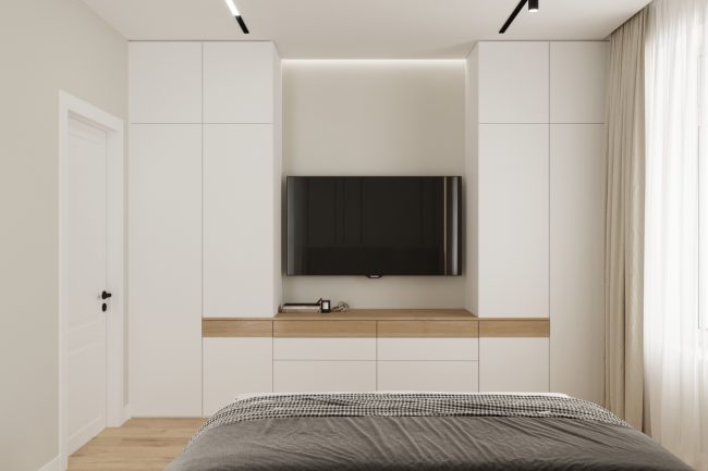 - Sypialnia — to miejsce relaksu, w którym wykorzystano naturalne materiały i ciepłe odcienie, tworzące atmosferę spokoju.