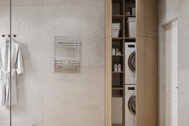 Ten projekt ma na celu stworzenie przestronnego i jasnego wnętrza, które łączy minimalizm z wyrafinowanymi detalami. Ważną rolę odgrywają nieklasyczne elementy w wystroju, które nadają wnętrzu unikalności i nowoczesności. Drewno, kamień i jasne odcienie są głównymi materiałami, które podkreślają przytulność i nowoczesny charakter domu.