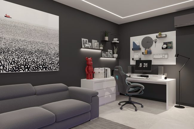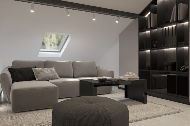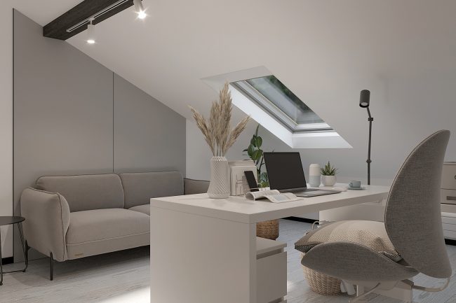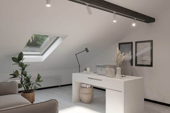 Na ostatnim piętrze strefa na poddaszu pod skośnym dachem będzie idealnym miejscem do oglądania filmów, a strefa biurowa — do pracy z domu.