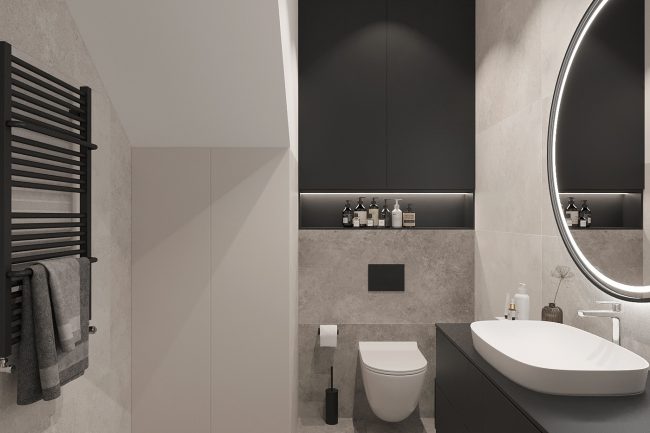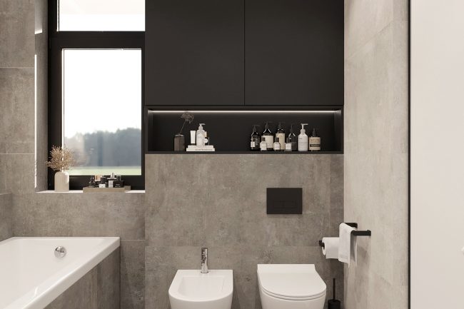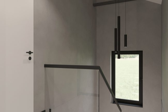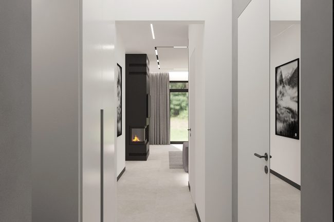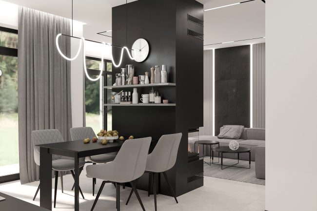 Na parterze wąski korytarz z dużą szafą może być praktyczny, jeśli odpowiednio rozmieścić meble. Kotłownia stanie się idealnym miejscem do przechowywania drewna, a łazienka będzie wygodna dla gości. Duża kuchnia — salon z jadalnym stołem stanie się idealnym miejscem do spotkań z przyjaciółmi i rodziną. Salon z wyjściem na taras wprowadzi więcej światła i przestrzeni do wnętrza. Kuchnia z czarnymi frontami doda więcej tekstury i naturalnej atmosfery. Duży szary narożnik będzie idealnym miejscem do odpoczynku, a kominek doda przytulności i stworzy ciepłą atmosferę.