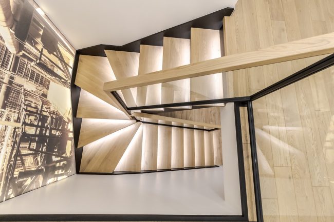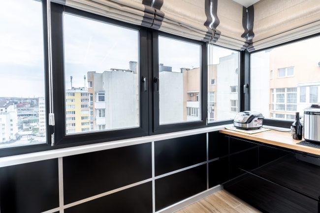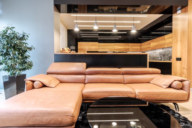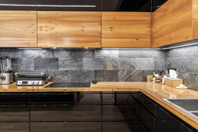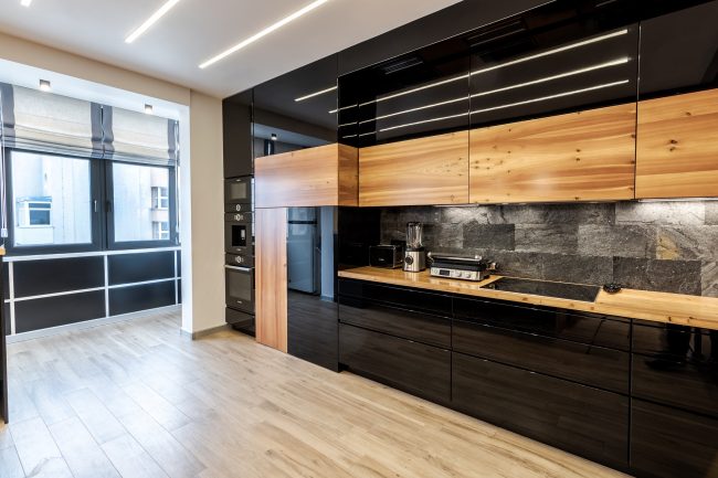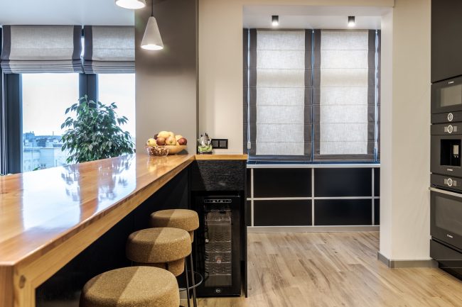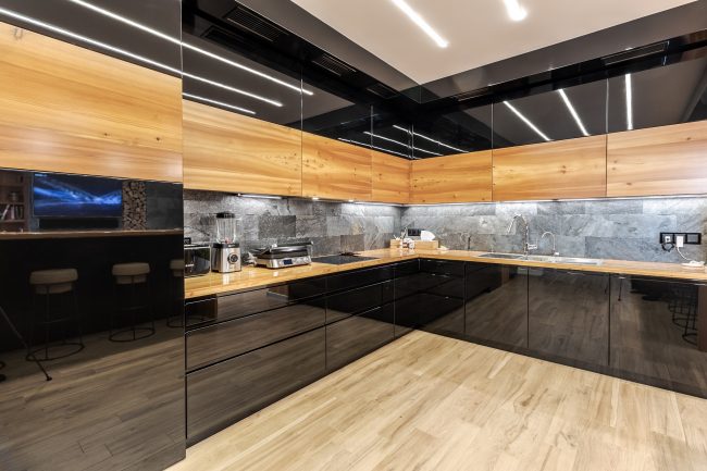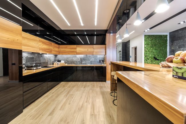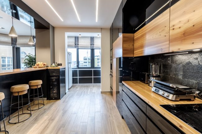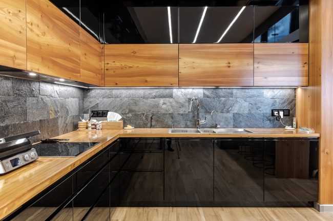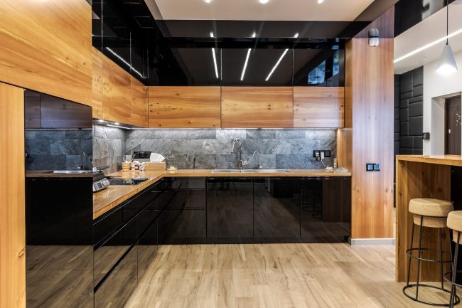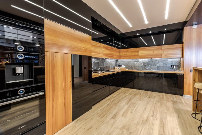 Дизайн кухні виступає логічним продовженням вітальні. Відсутність зайвих стін між вітальнею та кухонною зоною дозволяє створити загальну композиційну єдність і досягти візуального розширення простору. Виготовлені на замовлення чорні глянцеві фасади кухонного гарнітуру, вкриті рояльним лаком, контрастують з відкидними дверцятами підвісних шафок з деревини модрини, натяжна стеля повторює відтінок дивана та підсвічується. Розмежування досягається за допомогою простого та влучного рішення – ряду світильників у стилі хай-тек.