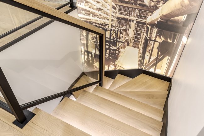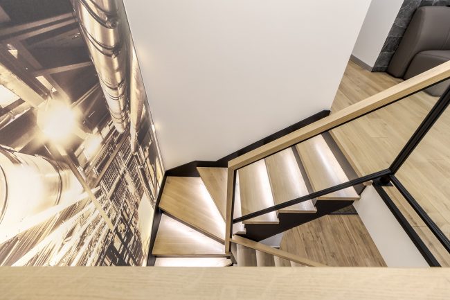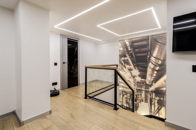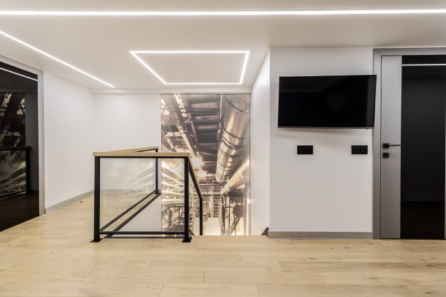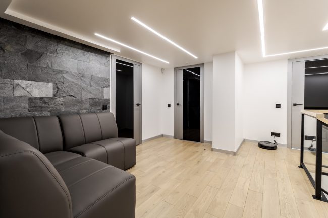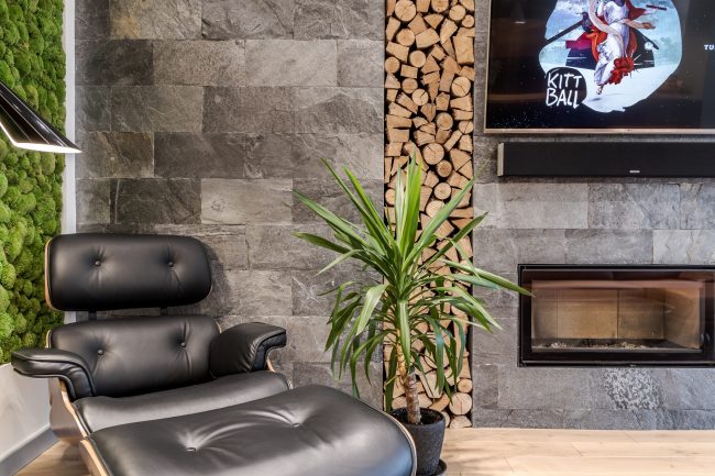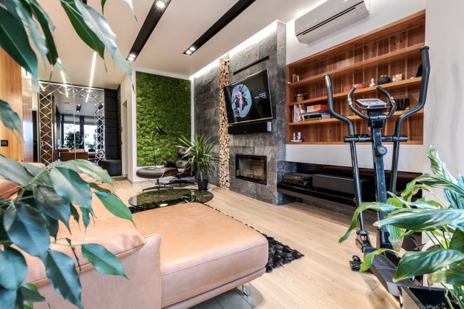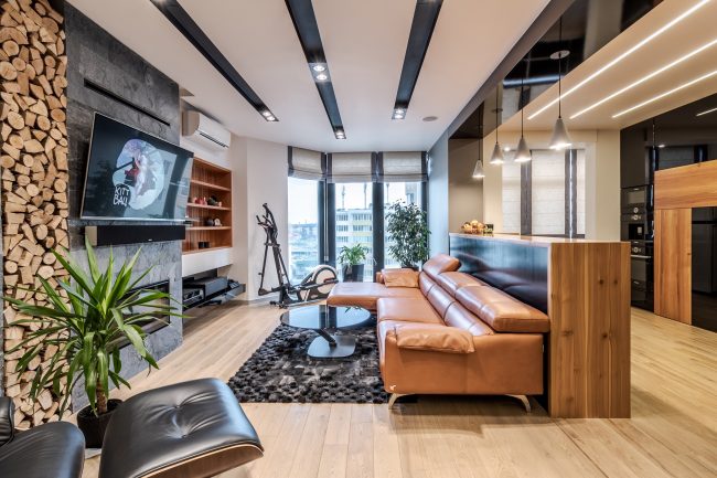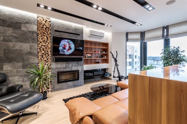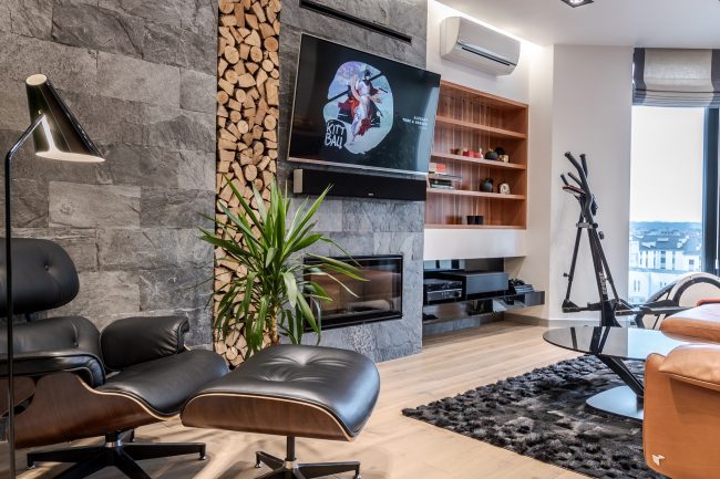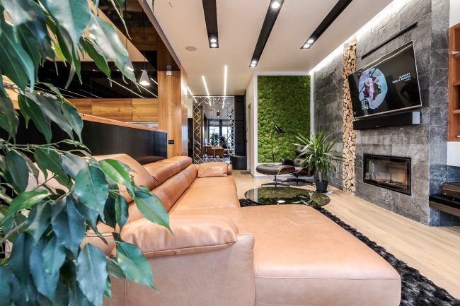 Інтер’єр вітальні створювався з максимальним врахуванням побажань замовника, тому у ньому присутні строга кольорова гама, сучасна вмонтована техніка, камін, оздоблення плитами натурального сланцю, великий кутовий диван з оббивкою з натуральної шкіри, вбудована відкрита шафка з дерева модрини та оригінальна полінниця, сучасне точкове освітлення, вмонтоване в стелю.