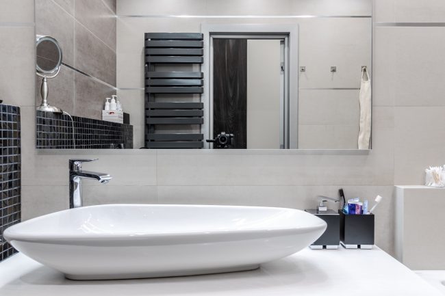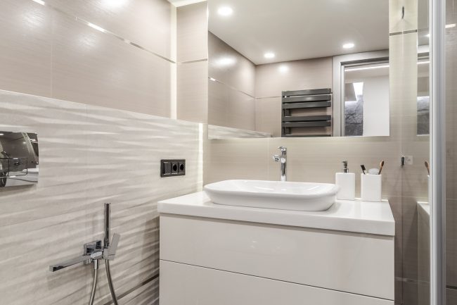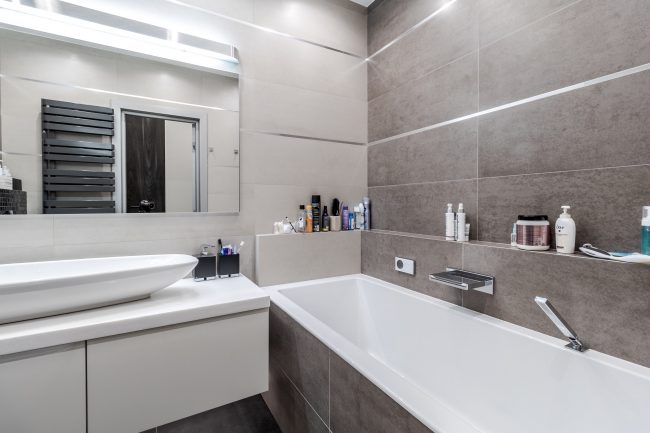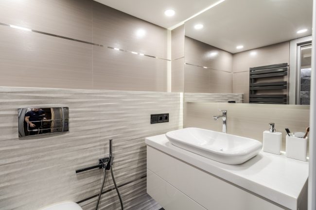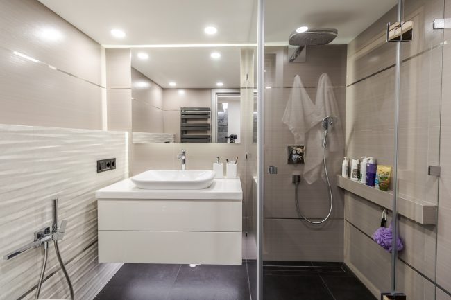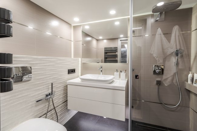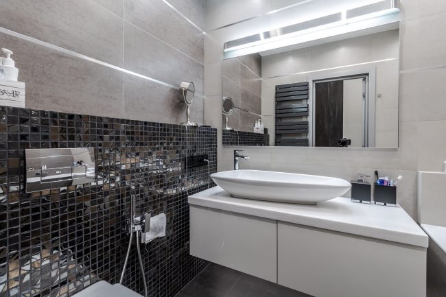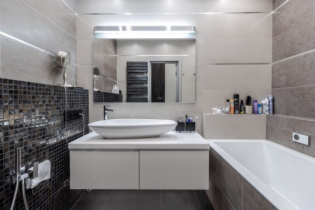 Дизайн санвузла – максимально лаконічний, з традиційною плиткою на стінах та підлозі різних відтінків сірого. Родзинку інтер’єру ванни додають контрастні панелі, що створюють виступ на стіні, оздоблений мозаїчною плиткою, біла тумба під раковину незвичайної форми, що нагадує пелюстку, дорога вмонтована в стіну сантехніка, та величезне дзеркало.