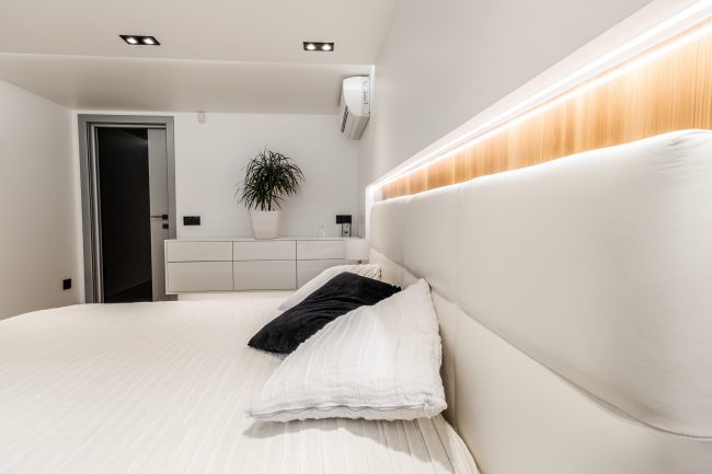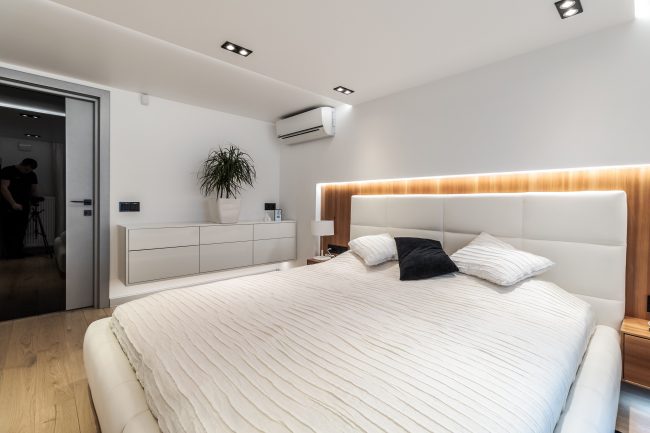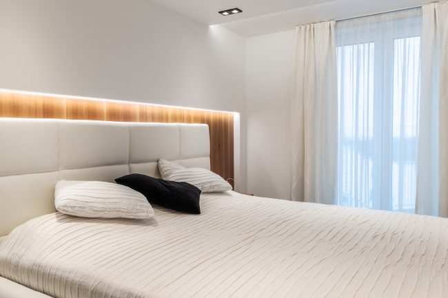 Гармонія досягається за рахунок ретельного підбору відтінків та фактур. Надзвичайно ефектними деталями є дзеркальний фасад шафи-купе та столик з стільницею з темного скла та рухомою ніжкою сучасної технологічної конструкції. Замість традиційних штор надано перевагу римським, що приховують велике потрійне французьке вікно.