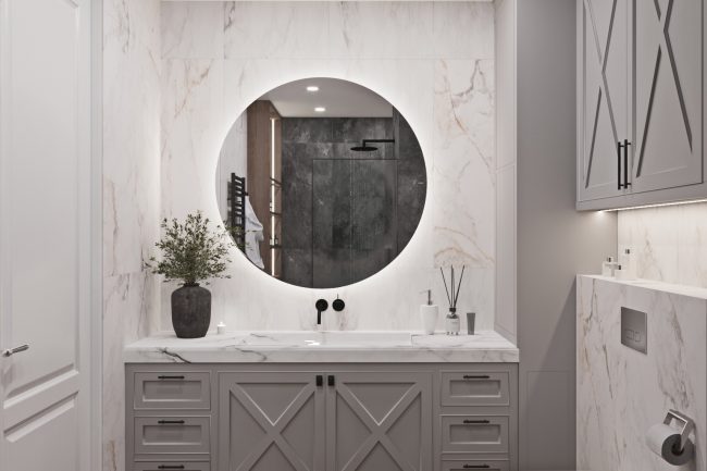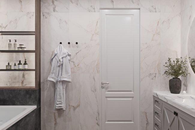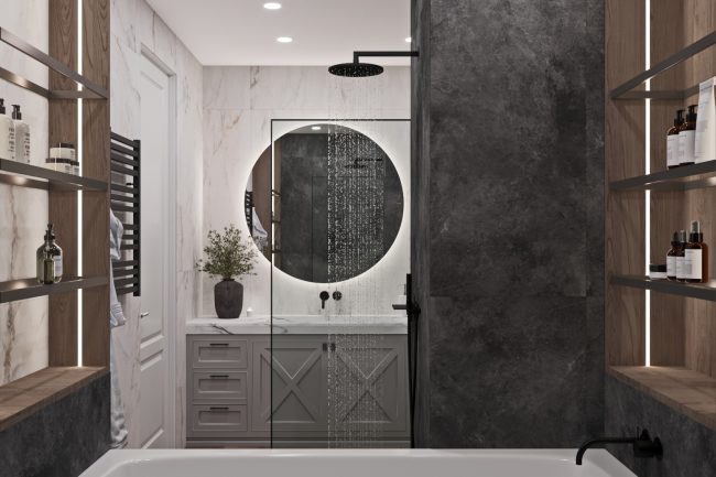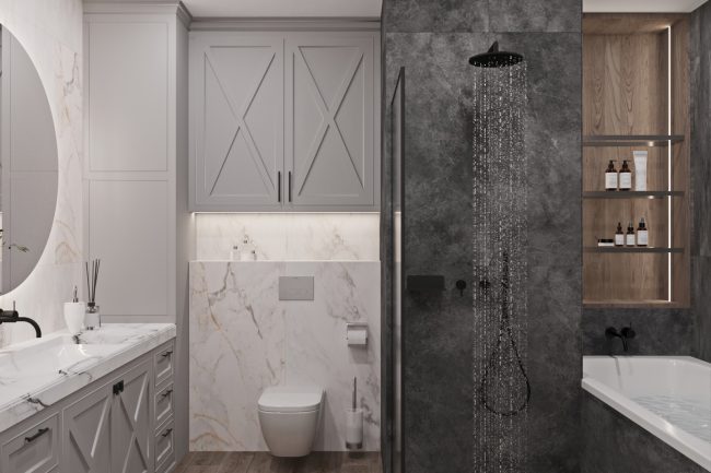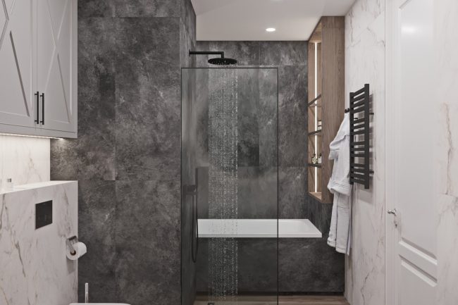 W łazience użyto kombinacji płytek łupkowych w kolorze grafitowym oraz marmuru calacatta. Tworzy to stylową i nowoczesną aranżację wnętrza.
