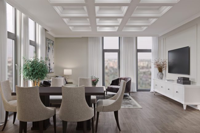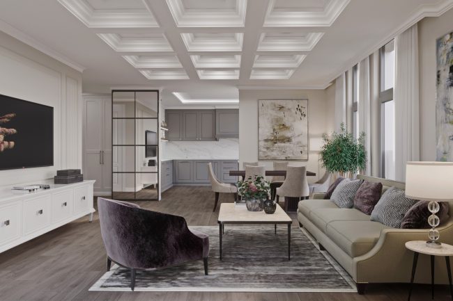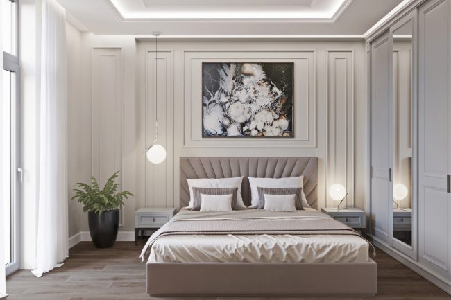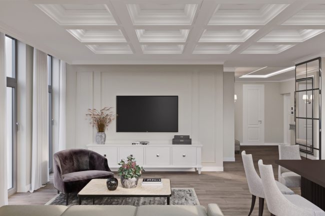 Taki neoklasyczny wystrój mieszkania daje wrażenie luksusu i wyrafinowania, wypełniając przestrzeń estetyką i przytulnością.