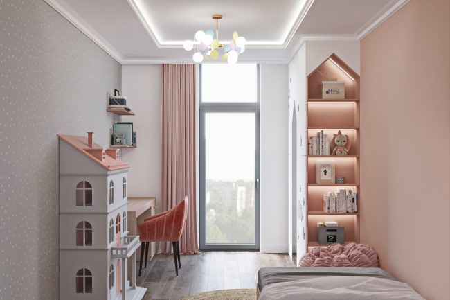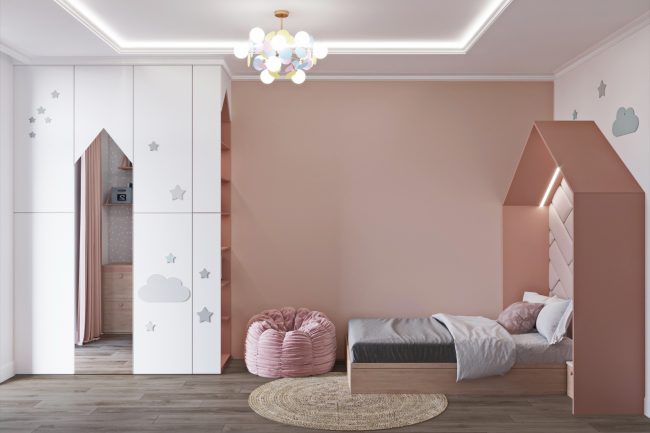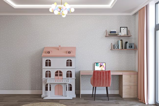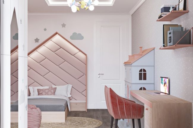 Pokój dziecięcy dla dziewczynki jest utrzymany w różowych kolorach, z miękkimi panelami na ścianie i różowymi akcentami. Tworzy to bajkową atmosferę, która sprzyja kreatywności i rozwojowi dziecka.