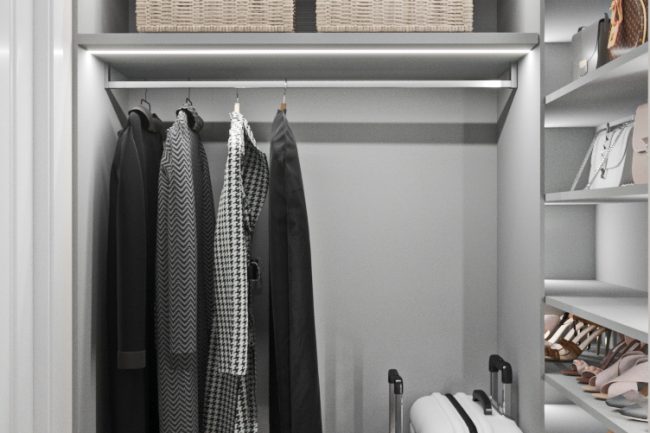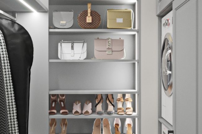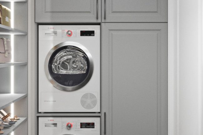 W garderobie znajduje się pralka i suszarka, a szafa w jasnoszarych odcieniach z klasycznymi frontami nadaje pomieszczeniu prostoty i funkcjonalności.