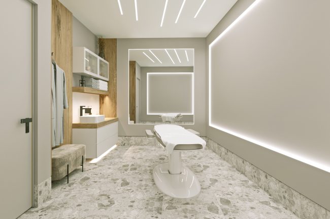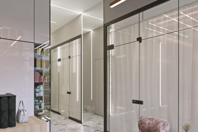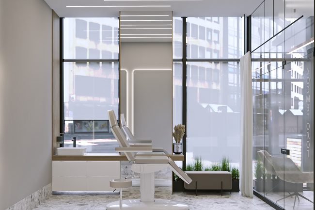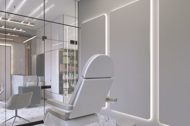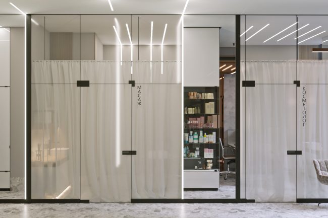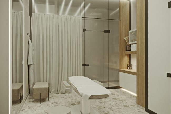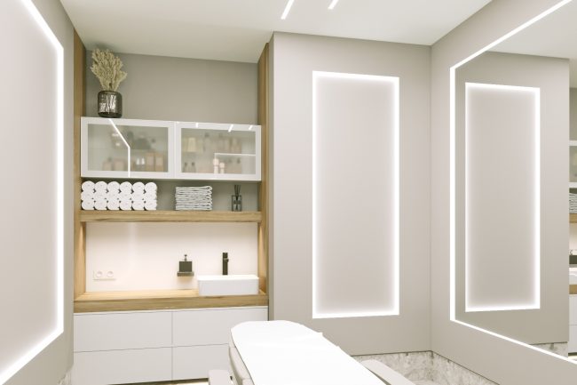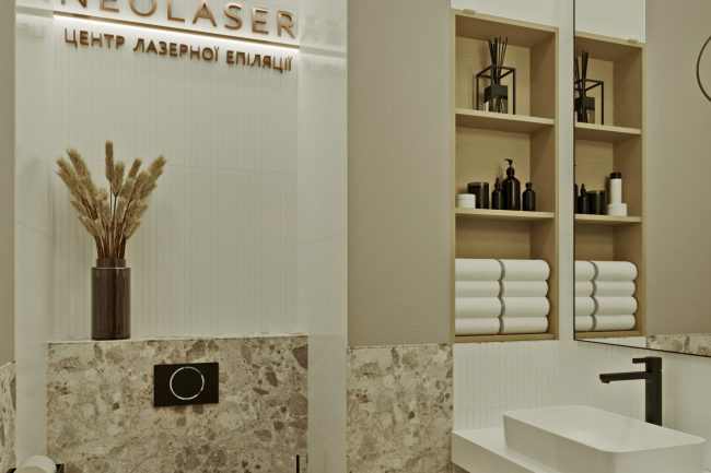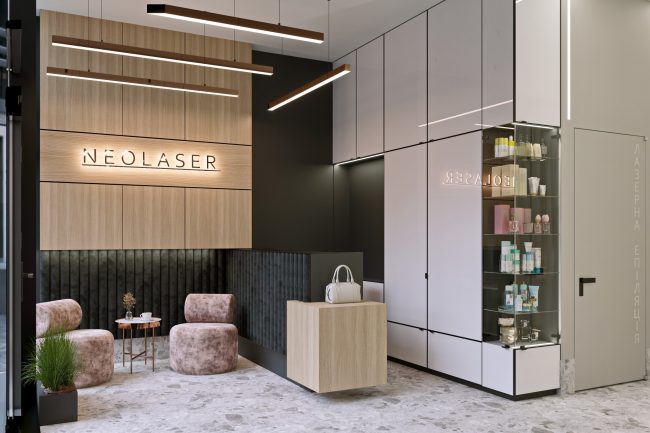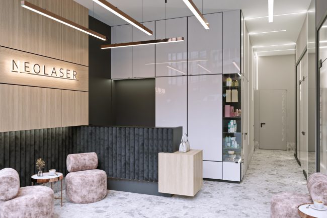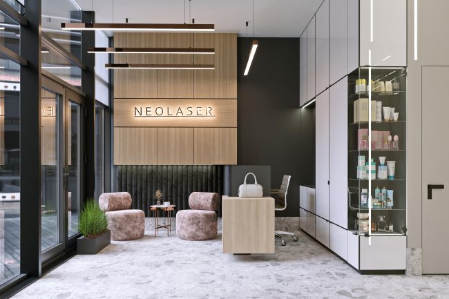 Salon depilacji laserowej „Neolaser” zachwyca swoim nowoczesnym stylem, gdzie czarne kolory i białe połyskliwe powierzchnie tworzą wrażenie elegancji i luksusu. Wnętrze jest urządzone z wykorzystaniem szklanych przegrod, które nadają przestrzeni poczucie otwartości i lekkości, zapewniając jednocześnie prywatność dla klientów.