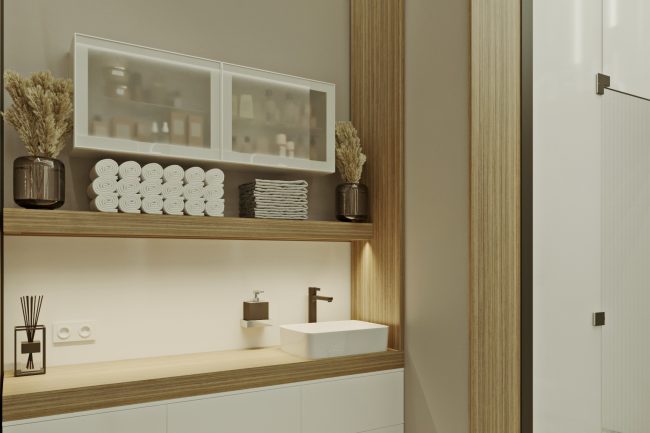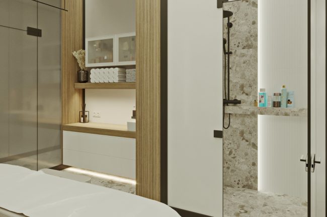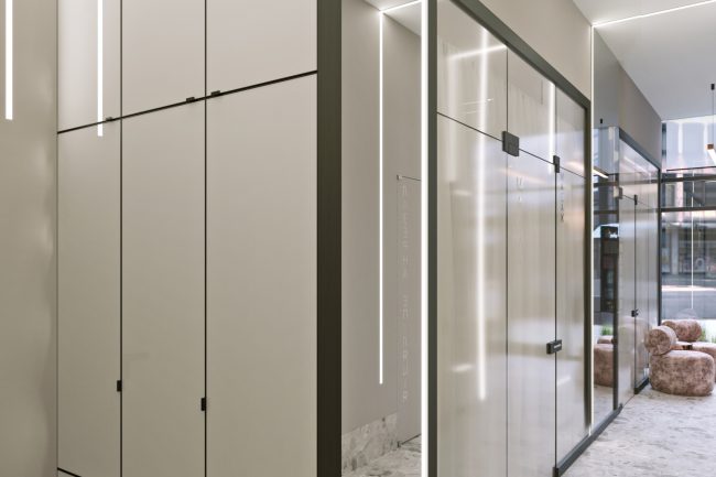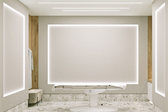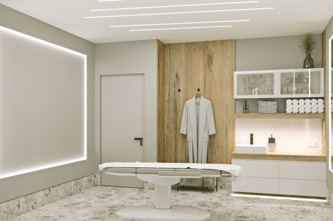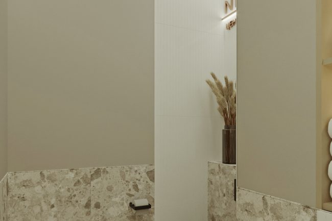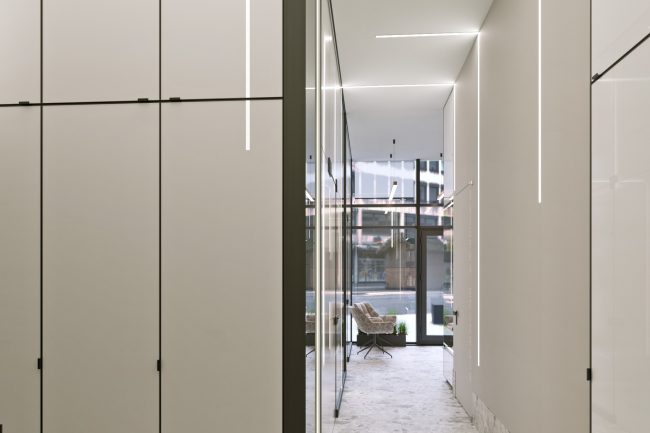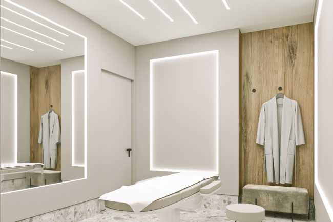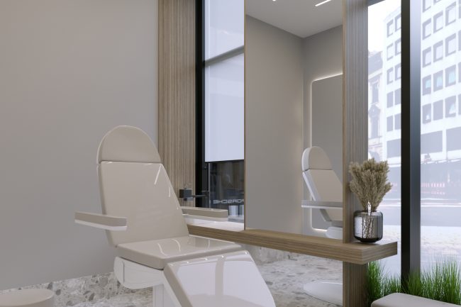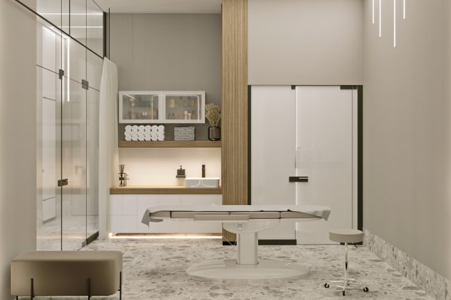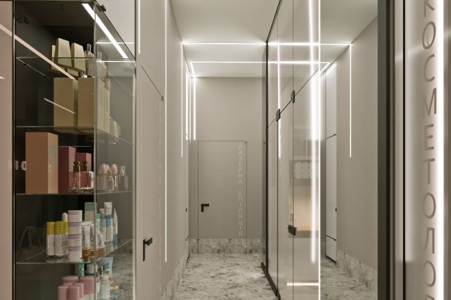Salon depilacji laserowej „Neolaser” zachwyca swoim nowoczesnym stylem, gdzie czarne kolory i białe połyskliwe powierzchnie tworzą wrażenie elegancji i luksusu. Wnętrze jest urządzone z wykorzystaniem szklanych przegrod, które nadają przestrzeni poczucie otwartości i lekkości, zapewniając jednocześnie prywatność dla klientów.