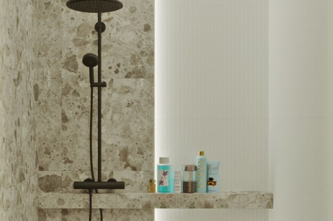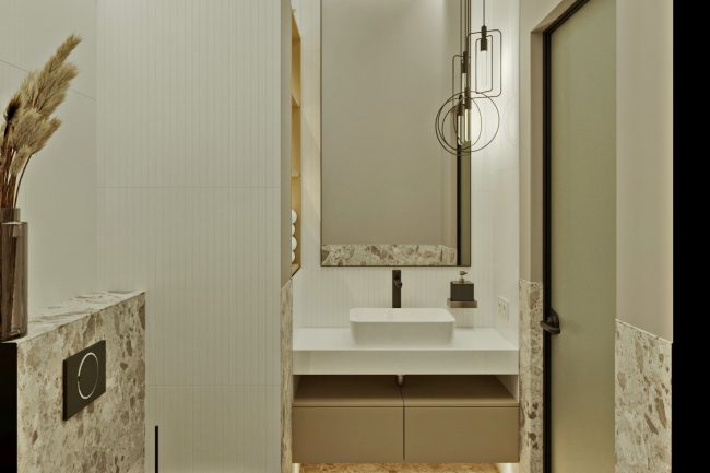 Na podłodze użyto stylowej płytki terazzo, która nie tylko dodaje estetyki, ale także sprawia, że pomieszczenie jest bardziej praktyczne. Drewniane powierzchnie w meblach dodają przytulności i ciepła, tworząc komfortową atmosferę dla odwiedzających.