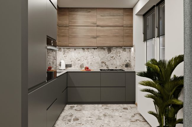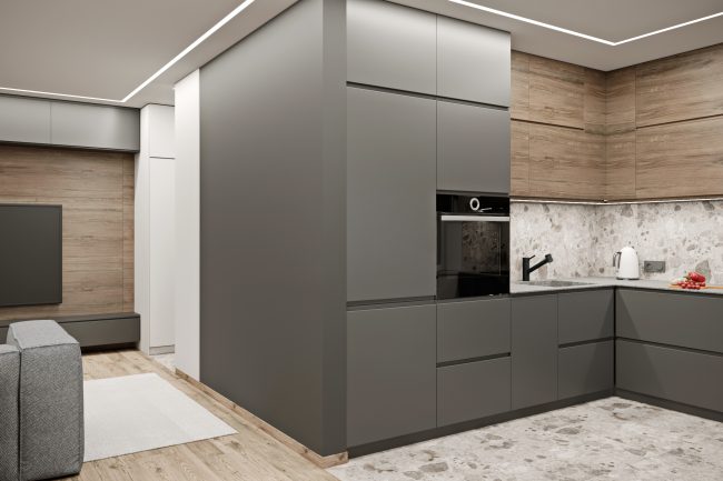 Kuchnia i salon są połączone w jedną funkcjonalną przestrzeń, tworząc poczucie przestronności i otwartości. Cały sprzęt AGD w kuchni jest wbudowany, w tym ukryta lodówka, co dodaje wnętrzu minimalistycznego charakteru. Na podłodze znajduje się laminat drewnopodobny, który dodaje wnętrzu ciepła i przytulności.