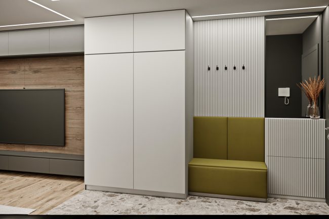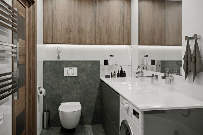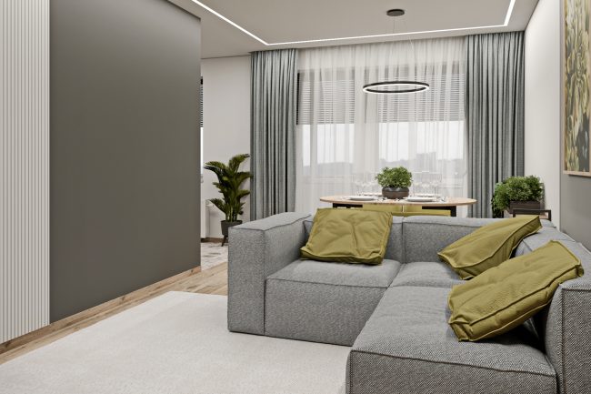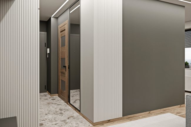 To dwupokojowe mieszkanie, urządzone w nowoczesnym stylu, zostało stworzone dla tych, którzy cenią sobie wygodę i estetykę. W salonie ściana za kanapą ozdobiona jest białymi listwami, co dodaje wnętrzu lekkości i stylu. Wiele powierzchni imitujących beton nadaje pomieszczeniu nowoczesny, industrialny wygląd.