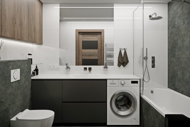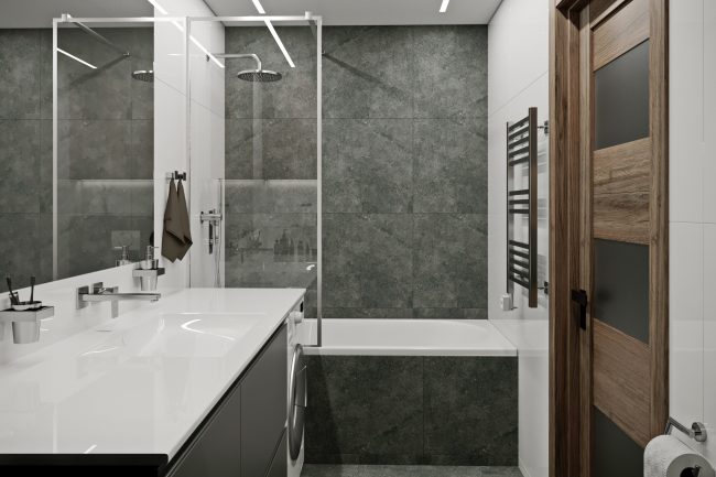 W łazience podłoga wyłożona jest płytkami imitującymi beton, co podkreśla nowoczesny charakter projektu i ułatwia codzienną pielęgnację.