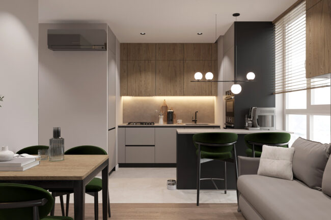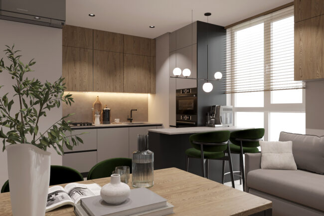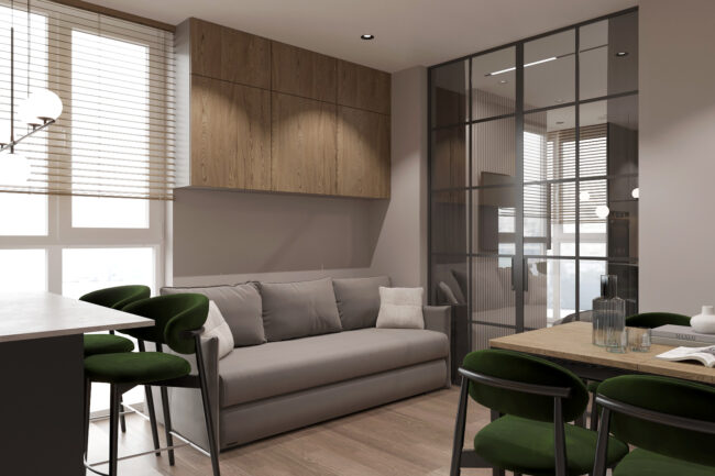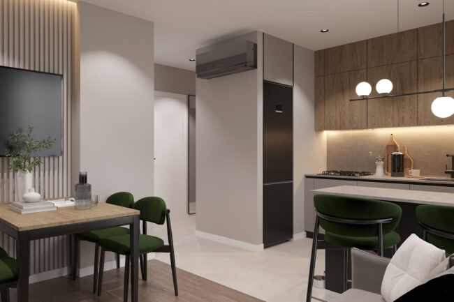 Квартира створена для молодої сім’ї з дитиною, поєднуючи сучасний стиль, функціональність та затишок. Використані натуральні матеріали, спокійні відтінки та ергономічне зонування, що забезпечує комфорт для кожного мешканця.