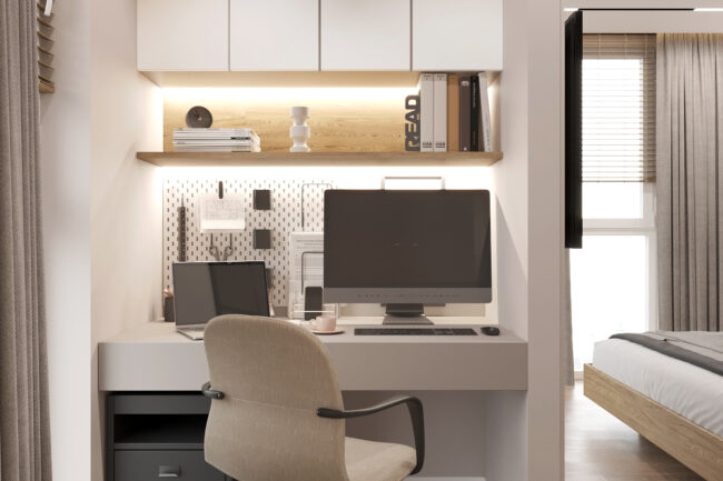 ✔ Робочий куточок – окрема зона біля вікна з ергономічним столом для роботи.
