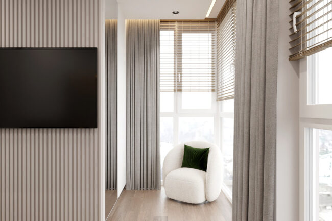 🔹 Лоджія – зона релаксу з кріслом та панорамними вікнами, що наповнюють квартиру світлом.