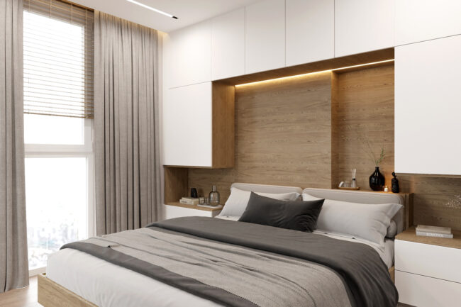 ✔ Гардеробна зона – місткі шафи з підсвіткою та вбудовані системи зберігання.