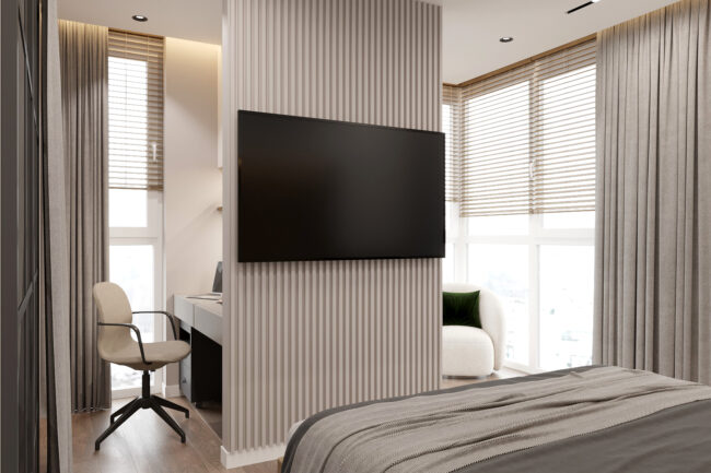 ✔ Вітальня – сірий диван, журнальний столик та ТВ-зона з декоративними панелями, що додають тепла інтер’єру.