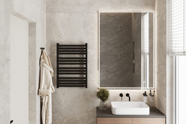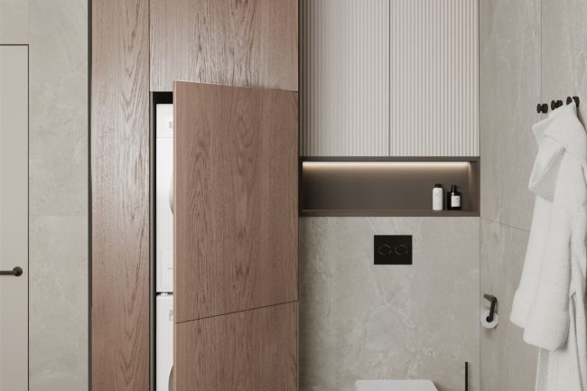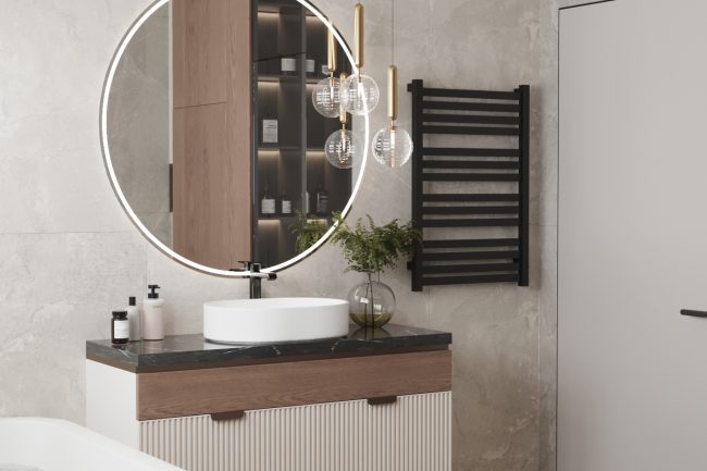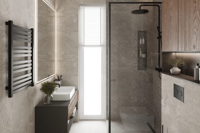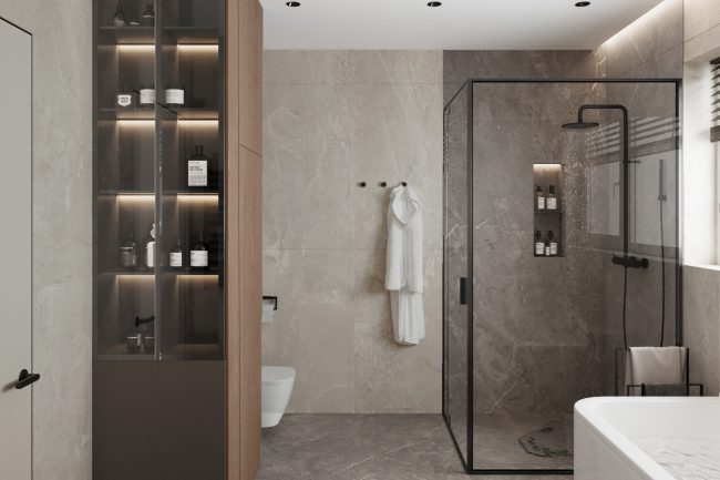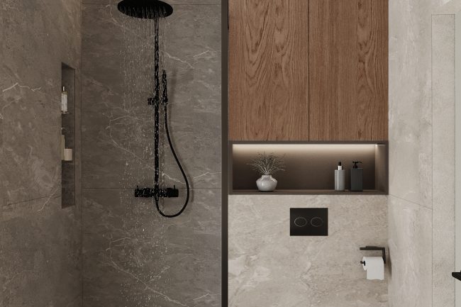Ванна кімната виконана в сірих відтінках, з використанням плитки під сланець та чорної сантехніки. Окремо стояча ванна та велике вікно додають простору світлості та затишку. Зона умивальників з чорною стільницею під мармур та круглим дзеркалом з контурною підсвіткою створюють елегантний та сучасний образ.