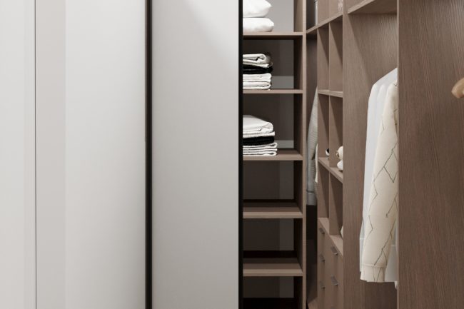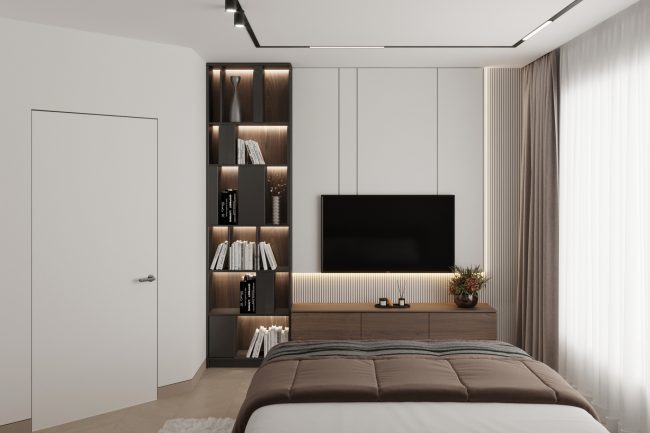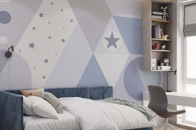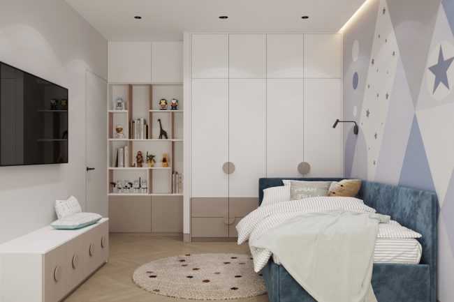 У господарській спальні встановлено велике сіре м’яке ліжко, туалетний столик та дзеркало до стелі, що додає простір та функційність. Дитяча кімната прикрашена фото-шпалерами з текстурою зірочок, має комод з телевізором та велику шафу для одягу і полички для іграшок, створюючи простір для творчості та гри.