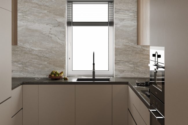 Зона столової вільно переходить у зону кухні. Великий дерев’яний стіл та шафа для сервірування з підсвіткою створюють стильний і функціональний простір для прийому їжі та розваг. Кухня виконана у формі букви “П”, з входом у кладову.