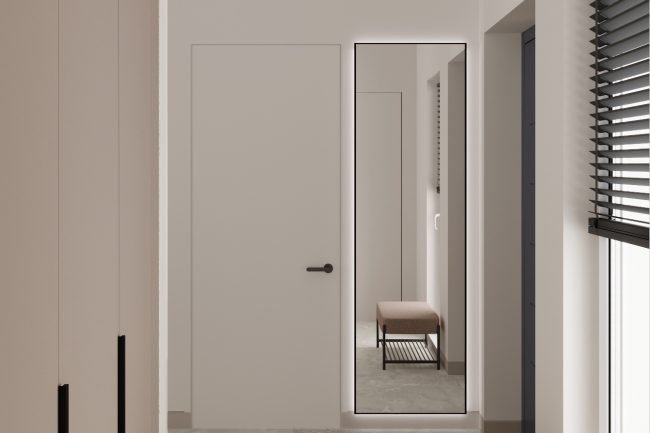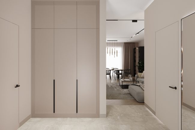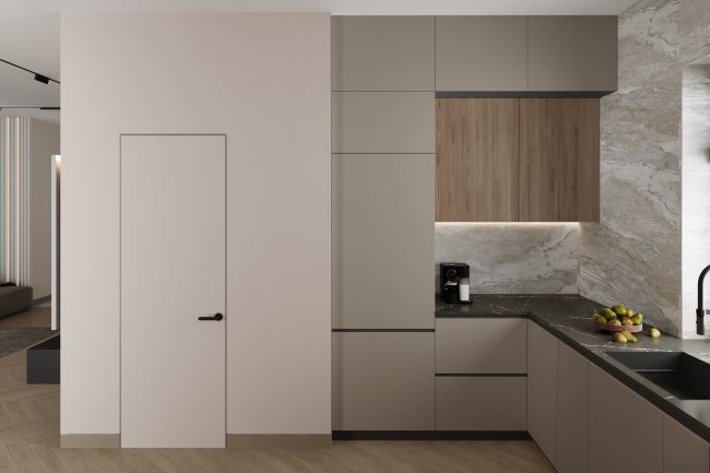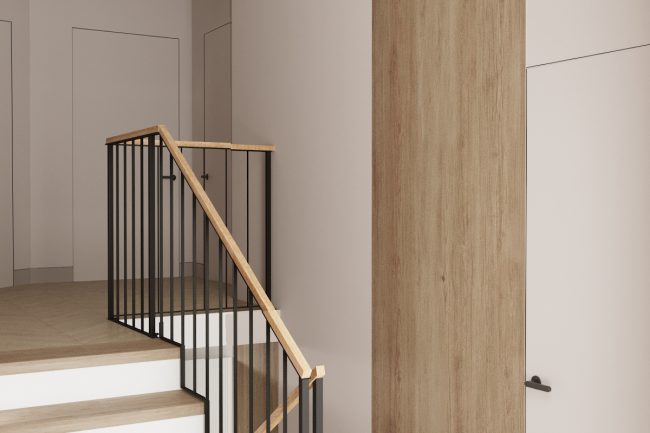 Підлога в коридорі вкрита плиткою, яка імітує натуральний камінь, переходячи плавно в дерев’яну підлогу викладену в стилі французька ялинка у вітальні та кухні. Це створює враження послідовного об’єднання просторів.